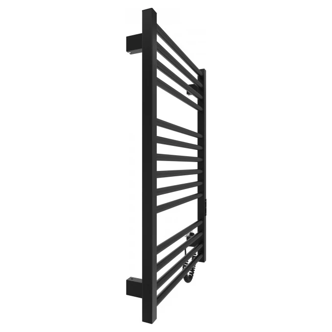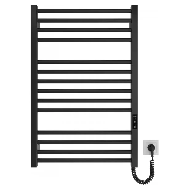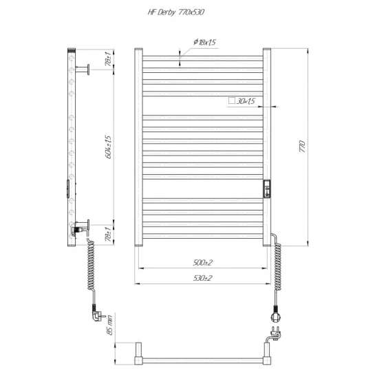 Електрична рушникосушарка HF Derby 770x530. Працює за технологією сухого ТЕНу. Обладнана вбудованим таймер-регулятором і конектором для підключення до живлення з будь-якого боку. Оснащена комплектом для прихованого підключення. Модель має 14 ребер з круглої труби та стійки з квадратного профілю. Матеріал - чорна сталь з антикорозійною обробкою. Варіанти покриття: чорний мат або білий мат. Температурні режими таймер-регулятора: 40°С, 45°С, 50°С. Час роботи: 3, 6 годин або постійний нагрів. Потужність 145 Вт. Гарантія - 3 роки