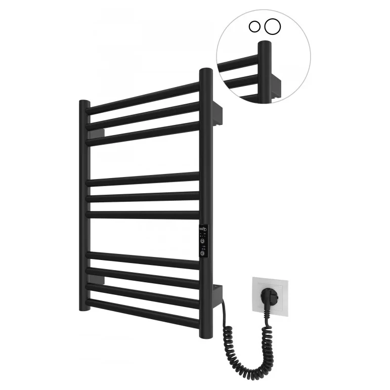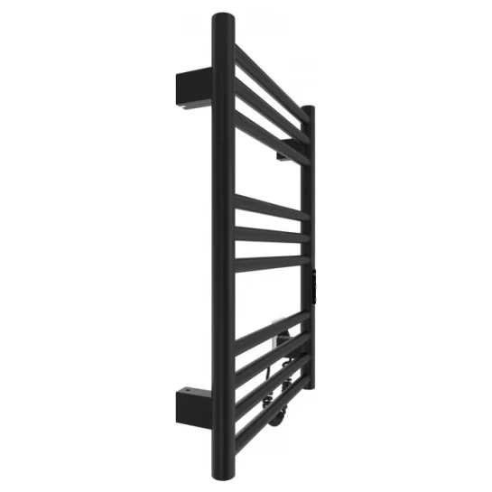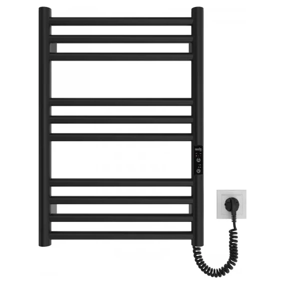 Електрична рушникосушарка HF Greenwich 570x430. Працює за технологією сухого ТЕНу. Обладнана вбудованим таймер-регулятором і конектором для підключення до живлення з будь-якого боку. Оснащена комплектом для прихованого підключення. Модель має 10 ребро з круглої труби та стійки з круглої труби. Матеріал - чорна сталь з антикорозійною обробкою. Варіанти покриття: чорний мат або білий мат. Температурні режими таймер-регулятора: 40°С, 45°С, 50°С. Час роботи: 3, 6 годин або постійний нагрів. Потужність 90 Вт. Гарантія - 3 роки.