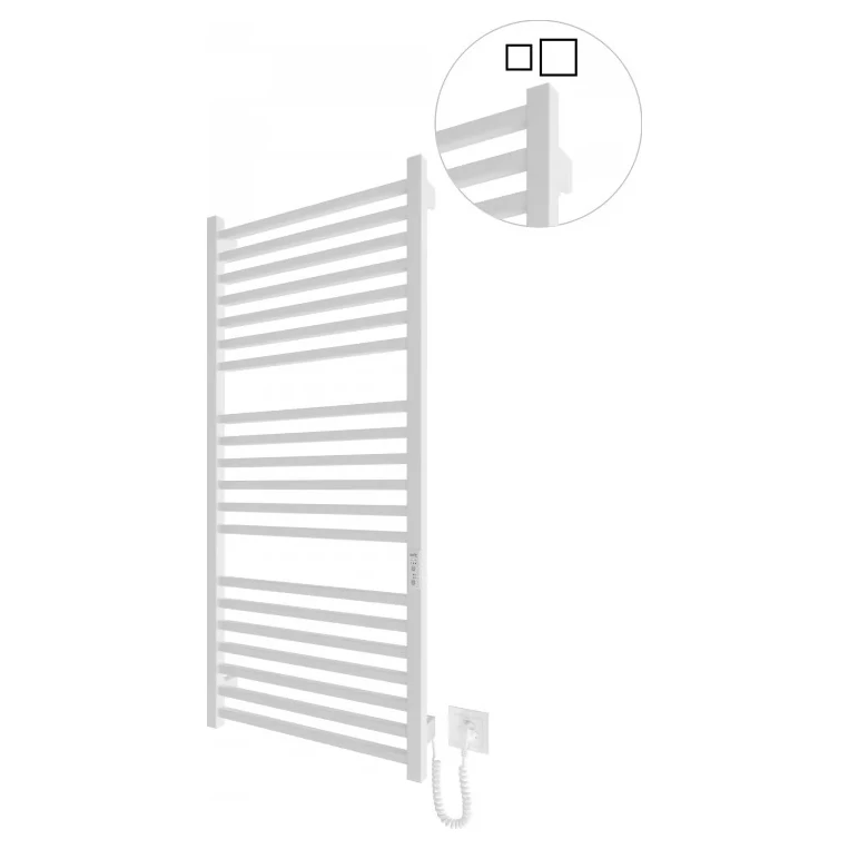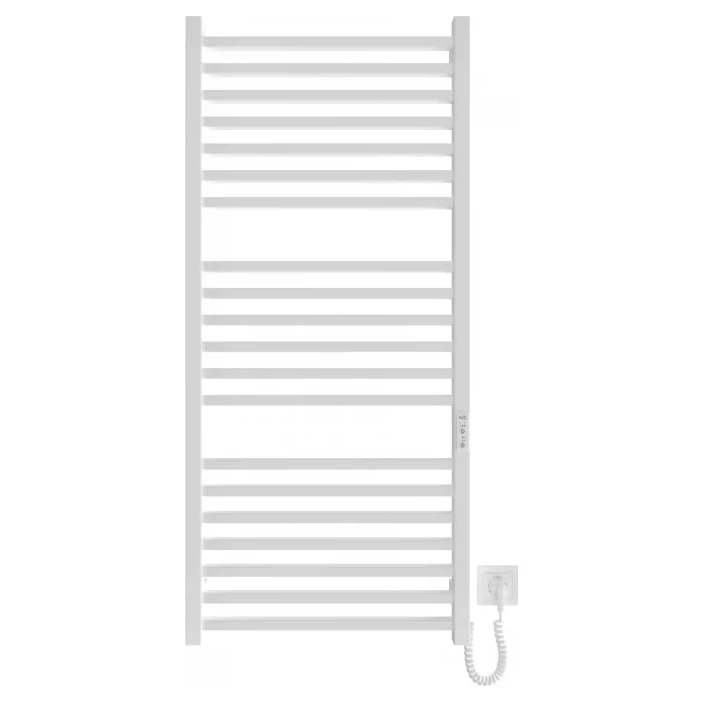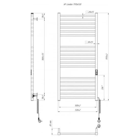 Електрична рушникосушарка HF London 1170х530. Працює за технологією сухого ТЕНу. Обладнана вбудованим таймер-регулятором і конектором для підключення до живлення з будь-якого боку. Оснащена комплектом для прихованого підключення. Модель має 21 ребр з квадратної труби та стійки з квадратної труби. Матеріал - чорна сталь з антикорозійною обробкою(фосфотація). Варіанти покриття: чорний мат або білий мат. Температурні режими таймер-регулятора: 40°С, 45°С, 50°С. Час роботи: 3, 6 годин або постійний нагрів. Потужність 240 Вт. Гарантія - 3 роки.