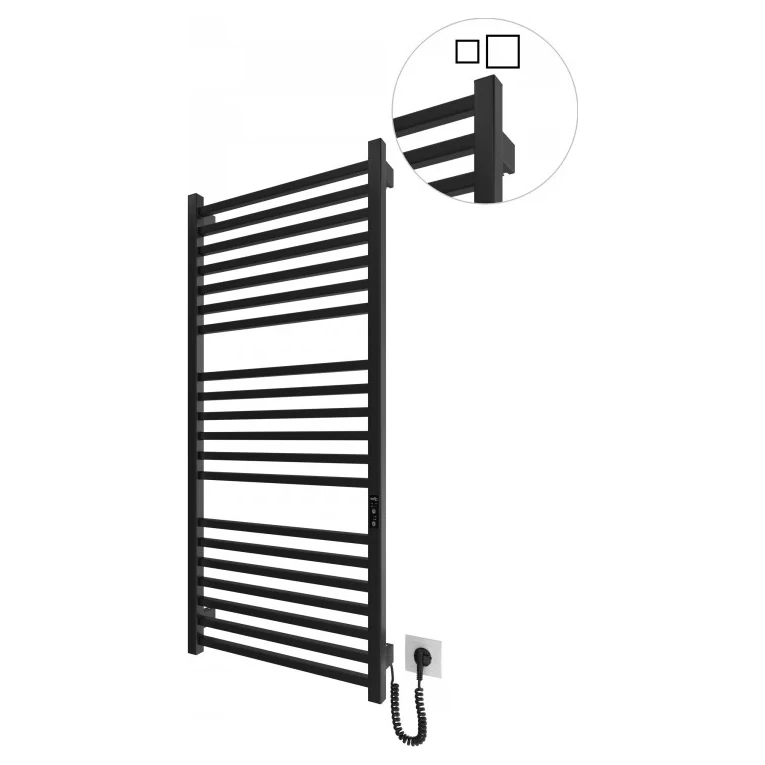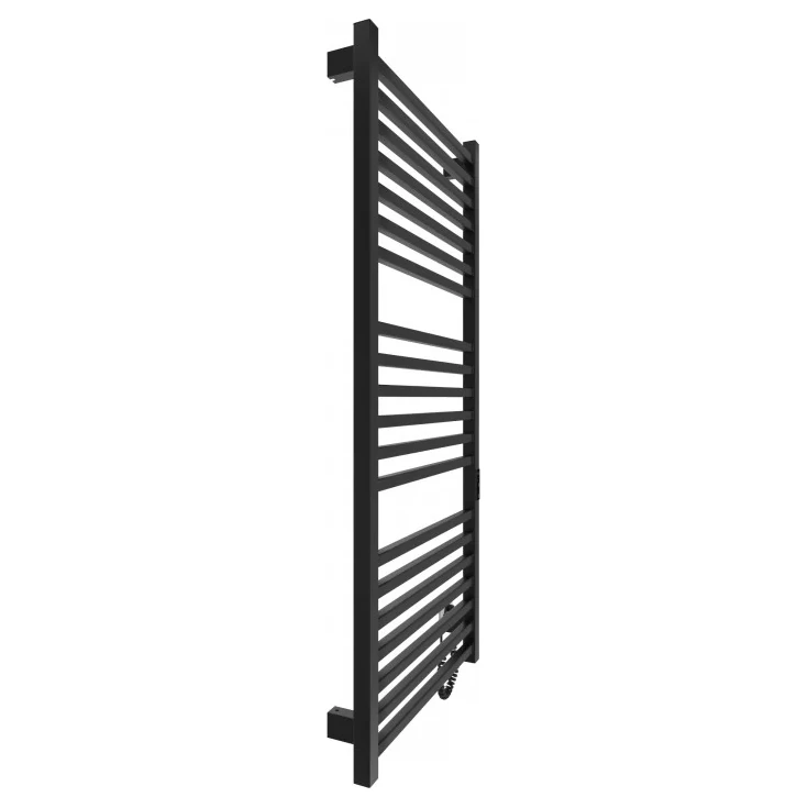 Електрична рушникосушарка HF London 1170х530. Працює за технологією сухого ТЕНу. Обладнана вбудованим таймер-регулятором і конектором для підключення до живлення з будь-якого боку. Оснащена комплектом для прихованого підключення. Модель має 21 ребр з квадратної труби та стійки з квадратної труби. Матеріал - чорна сталь з антикорозійною обробкою(фосфотація). Варіанти покриття: чорний мат або білий мат. Температурні режими таймер-регулятора: 40°С, 45°С, 50°С. Час роботи: 3, 6 годин або постійний нагрів. Потужність 240 Вт. Гарантія - 3 роки.