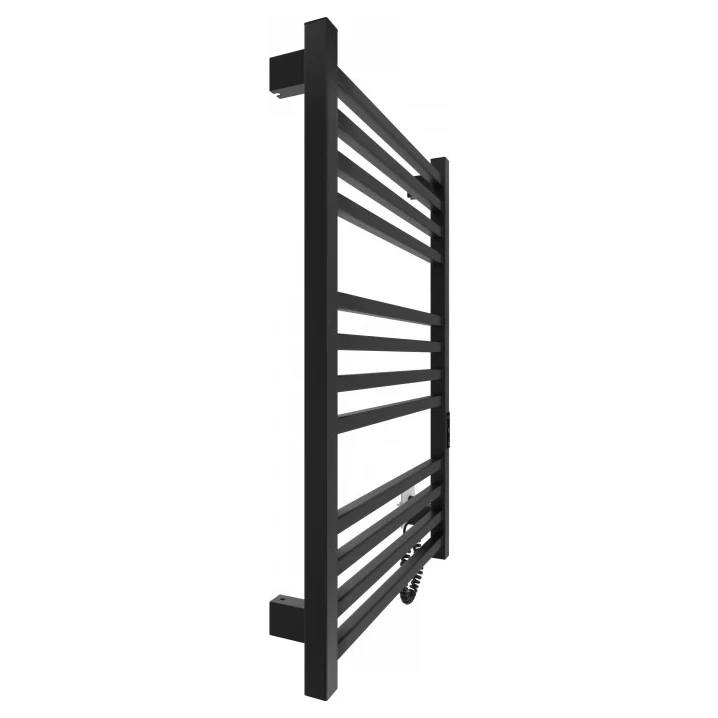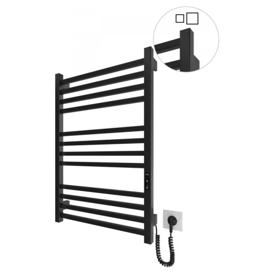 Електрична рушникосушарка HF London 770х530. Працює за технологією сухого ТЕНу. Обладнана вбудованим таймер-регулятором і конектором для підключення до живлення з будь-якого боку. Оснащена комплектом для прихованого підключення. Модель має 12 ребр з квадратної труби та стійки з квадратної труби. Матеріал - чорна сталь з антикорозійною обробкою(фосфотація). Варіанти покриття: чорний мат або білий мат. Температурні режими таймер-регулятора: 40°С, 45°С, 50°С. Час роботи: 3, 6 годин або постійний нагрів. Потужність 130 Вт. Гарантія - 3 роки.