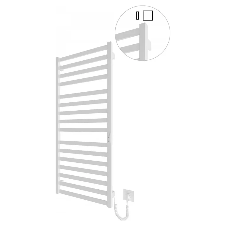 Електрична рушникосушарка HF Oxford 1170х530. Працює за технологією сухого ТЕНу. Обладнана вбудованим таймер-регулятором і конектором для підключення до живлення з будь-якого боку. Оснащена комплектом для прихованого підключення. Модель має 16 ребр з прямокутногої труби та стійки з квадратної труби. Матеріал - чорна сталь з антикорозійною обробкою(фосфотація). Варіанти покриття: чорний мат або білий мат. Температурні режими таймер-регулятора: 40°С, 45°С, 50°С. Час роботи: 3, 6 годин або постійний нагрів. Потужність 195 Вт. Гарантія - 3 роки.