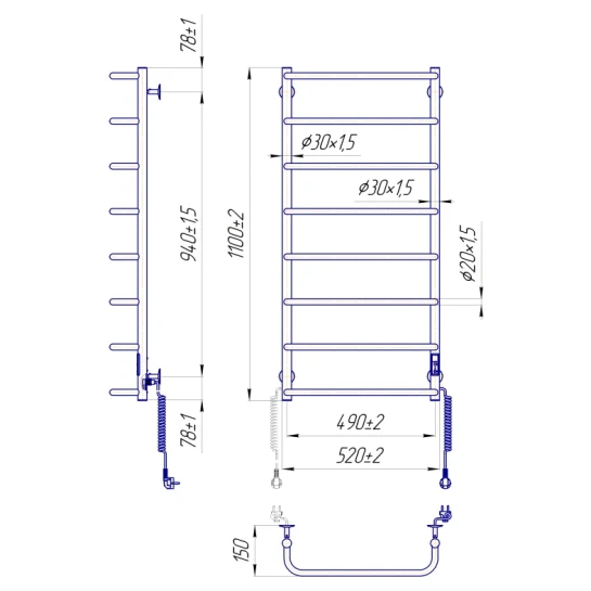 Електросушарка для рушників побутова Стандарт НР-І 1090х530/150 TR К. Обладнана таймер-регулятором та конектором для підключення в розетку з будь-якого боку. Сумісна з комплектом прихованого підключення. Має 8 ребер та стояки з круглої труби. Виготовлена з полірованої нержавіючої сталі без хромування. Варіанти покриття: полірована або сатин, чорний мат, білий глянець, золото, бронза. Температурні режими таймер-регулятора: 40°С, 45°С, 50°С. Варіанти часу роботи: 3, 6 годин та постійний нагрів. Потужність 135 Вт. Додатково для зручності користування можна оснастити навісними гачками. Гарантія - 5 років. Виробник залишає за собою право, без попереднього погодження із покупцем, вносити зміни в зовнішній вигляд та відтінок кольору таймер-регулятора. Такі зміни не впливають на основне, функціональне призначення таймер-регулятора в цілому.