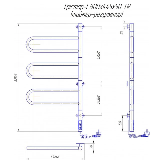 MARIO Рушникосушка Тристар-I 800х445/55 електр. TR Бренд: MARIO Країна-виробник: Україна Товарна категорія: Рушникосушки. Група: Рушникосушки з нержавійки (Рушникосушки з нержавіючої сталі) Тип: електро. Підключення: низ Артикул: 2.3.0408.11.P Кількість ребер: 3 Висота: 820 мм., Ширина: 445 мм., Глибина: 55 мм. Вага: 3,5 кг., Теплова потужність ТЕН: 80 Вт.