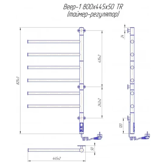 Електросушарка для рушників побутова Веєр-I 800х445/55 TR. Обладнана таймер-регулятором. Можлива варіація з комплектом прихованого підключення. Має 6 ребер які повертаються на 180* та стояк з круглої труби, . Виготовлена з полірованої нержавіючої сталі без хромування. Варіанти покриття: полірована. Температурні режими таймер-регулятора: 40°С, 45°С, 50°С. Варіанти часу роботи: 3, 6 годин та постійний нагрів. Потужність 80 Вт. Додатково для зручності користування можна оснастити навісними гачками. Гарантія - 5 років.