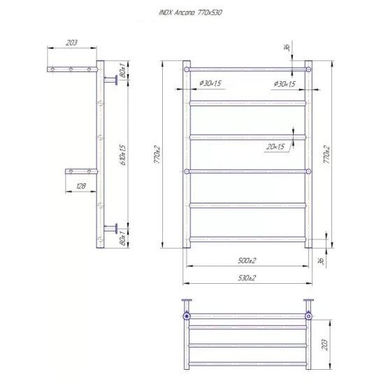 Рушникосушарка INOX Анкона 770х530/500. Розміри: висота - 770 мм, ширина - 530 мм, глибина 260 мм, міжцентрова відстань для підключення - 500 мм, діаметр підключення G1/2''. Варіанти підключення: нижнє, діагональне та бічне. Кількість ребер - 7. Виготовлена з полірованої нержавіючої сталі без хромування. Для всесезонної роботи водяну модель можна переобладнати на комбіновану, встановивши ТЕН, рекомендована потужність 300 Вт. Сумісні аксесуари: поворотні полиці та навісні гачки для збільшення функціональності. Рекомендовано підключати рушникосушарку за допомогою кранів Маріо. Гарантія - 50 років в закритій системі опалення, 5 років у централізованій.