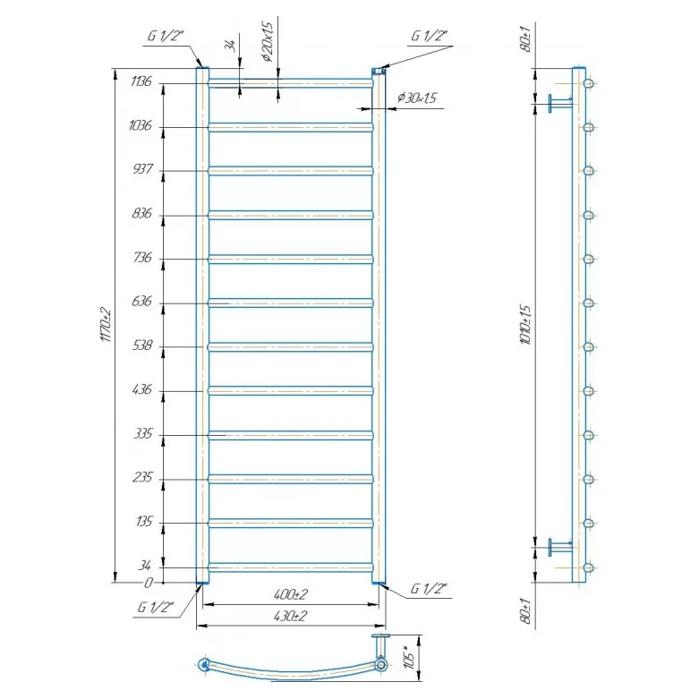 Рушникосушка INOX Класік 1170х430/400. Розміри: висота - 1 170 мм, ширина - 430 мм, глибина 90 мм, міжцентрове відстань для підключення - 400 мм, діаметр підключення G1/2''. Варіанти підключення: нижнє, діагональне та бічне. Кількість ребер – 12. Виготовлена з полірованої нержавіючої сталі без хромування. Для всесезонної роботи водяну модель можна переобладнати на комбіновану, встановивши ТЕН, рекомендована потужність 300 Вт. Сумісні аксесуари: поворотні поліці та навісні крючки для збільшення функціональності. Рекомендовано підключати рушникосушарку за допомогою кранів Маріо. Гарантія - 50 років у закритій системі опалення, 5 років у централізованій.