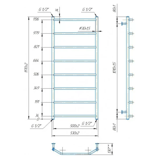 Рушникосушарка INOX Трапеція 1170х530/500. Розміри: висота - 1 170 мм, ширина - 530 мм, глибина 130 мм, міжцентрова відстань для підключення - 500 мм, діаметр підключення G1/2''. Варіанти підключення: нижнє, діагональне та бічне. Кількість ребер - 8. Виготовлена з полірованої нержавіючої сталі без хромування. Для всесезонної роботи водяну модель можна переобладнати на комбіновану, встановивши ТЕН, рекомендована потужність 300 Вт. Сумісні аксесуари: поворотні полиці та навісні гачки для збільшення функціональності. Рекомендовано підключати рушникосушарку за допомогою кранів Маріо. Гарантія - 50 років в закритій системі опалення, 5 років у централізованій.