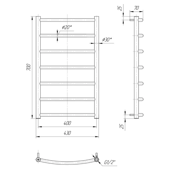 Товарна категорія: Рушникосушки. Група: Рушникосушки з нержавійки (Рушникосушки з нержавіючої сталі) Тип: Водяна. Підключення: Низ. MARIO Рушникосушка Класік 700х430/400 Бренд: MARIO Країна-виробник: Україна Модель: Класік Артикул: 1.1.0104.01.P Кількість ребер: 7 Висота: 700 мм., Ширина: 430 мм., Підключ: 400 мм Вага: 3,5 кг., Об'єм: 1,5 л. Теплова потужність 75/65/20 С: 123 Вт., Тен: 120 Вт.