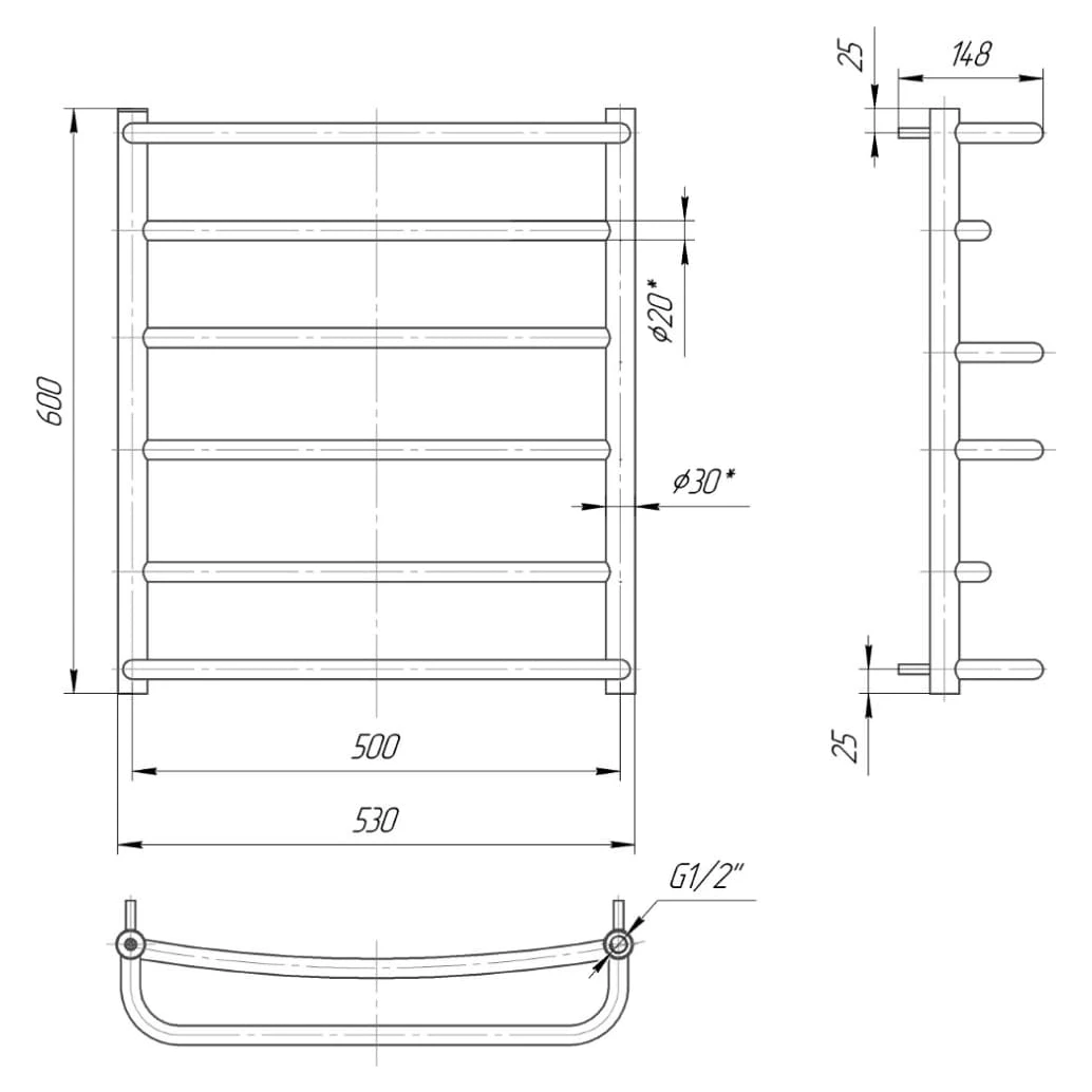 Товарна категорія: Рушникосушки. Група: Рушникосушки з нержавійки (Рушникосушки з нержавіючої сталі) Тип: Водяна. Підключення: Низ. MARIO Рушникосушка Люкс 600х530/500 Бренд: MARIO Країна-виробник: Україна Артикул: 1.1.0300.01.P Кількість ребер: 6 Висота: 600 мм., Ширина: 530 мм., Підключ: 500 мм. Вага: 3,9 кг., Об'єм: 1,5 л. Теплова потужність 75/65/20 С: 135 Вт., Тен: 120 Вт.