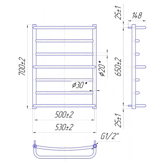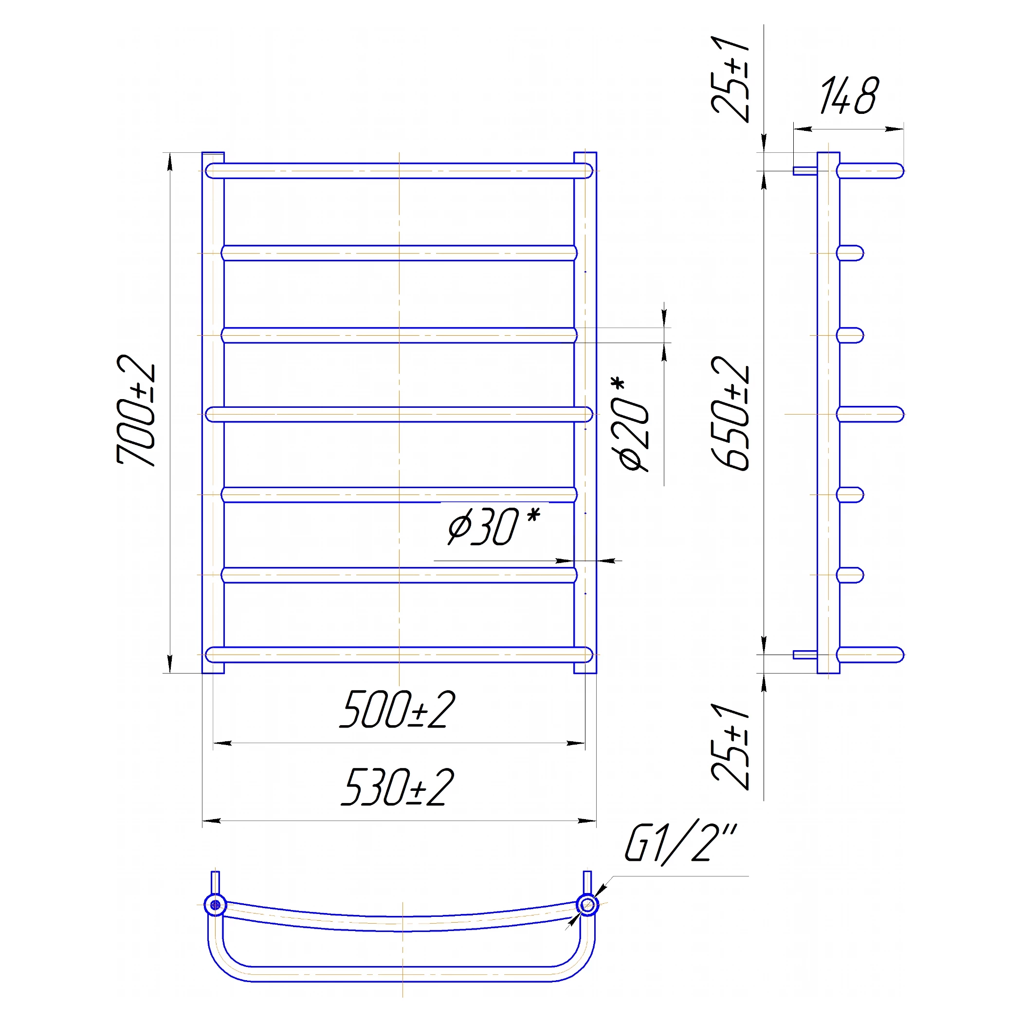 Створити комфорт у своєму будинку дуже просто: достатньо лише забезпечити свою ванну кімнату сухими рушниками та теплом. Сушарка для рушників Люкс 700x530/500, де 700 мм — висота, 530 мм — ширина, 500 мм — міжцентрова відстань, а діаметр під'єднання G 1/2", прекрасно підійде для створення затишку, особливо з огляду на цікавіший функціонал як 3 П-подібні перемички, розміщені рівномірно по всій висоті виробу. Вироблена з європейської неіржавкої сталі марки AISI 304, ця модель водяного типу також може бути монтована трубчастим електронагрівачем і стати електричною. Рекомендована потужність ТЕНа для виробу такого типорозміру — 120 W.