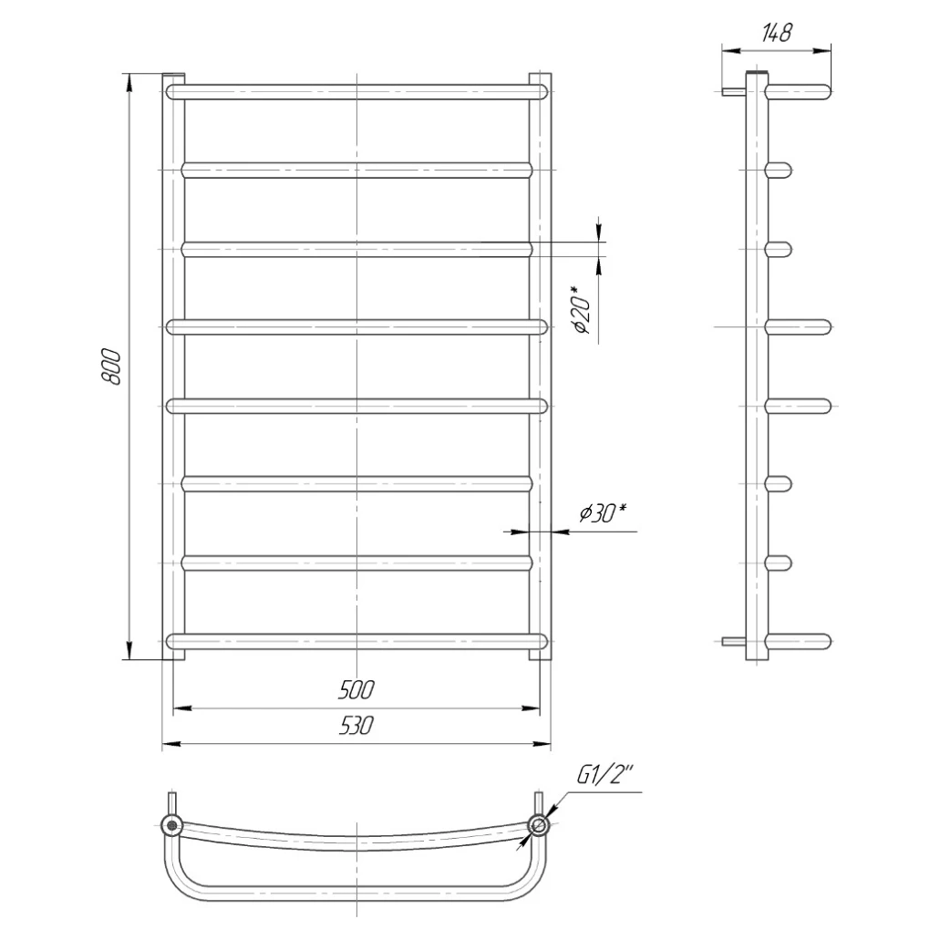 Рушникосушка «Маріо» серії Люкс має такі розміри: 80х53х17 см. Міжцентрова відстань під'єднання 50 см. Вісім секцій виконані з круглої труби. Виготовлена сушарка для рушників з якісної полірованої нержавіючої сталі (без хромування). Якщо є потреба забезпечити всесезонну роботи, то цю водяну модель можна переробити на комбіновану. Рекомендована потужність ТЕНу для встановлення 120 Вт. Об'єм: 1,9 л.