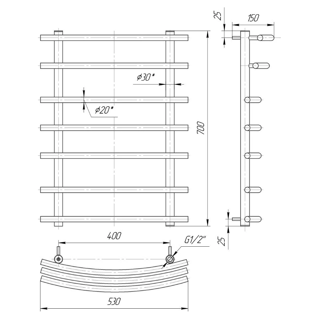 Рушникосушка виготовлена із нержавіючої сталі марки AISI 304, якій притаманна висока міцність та антикорозійна стійкість. Рушникосушка має поліровану поверхню, яка не втрачає зовнішнього вигляду протягом багатьох років. Колір: хром. Тип: стандарт. Кількість ребер: 7 шт . Підключення: нижнє (G 1/2"). Міжцентрова відстань: 400 мм. Габаритні розміри: 700 х 530 х 175 мм.
