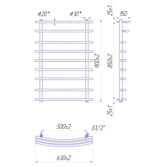 Рушникосушарка Маріо 900х630/500.дозволяє виконати нижнє, діагональне або бічне підведення води. Кількість секцій — 9, з круглої труби. Виготовлена з полірованої нержавіючої сталі. Для потреби водяну модель можна переобладнати на комбіновану, встановивши ТЕН, рекомендована потужність якого становить 200 Вт.