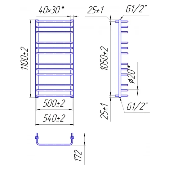Виробник: Mario Колекція: ПРЕМІУМ СТАНДАРТ Артикул: 1.2.0202.03.P Підключення: На гарячу воду Колір: Хром Гарантія: від виробника Рушникосушка Преміум Стандарт 1100х540/500 Характеристики: Висота 1100 мм Ширина 540 мм Глибина 170 мм Міжцентрова відстань 500 мм Кількість ребер: 12 Діаметр підключення: G 1/2 '' Обсяг 5,1 л Вага 9,3 кг Рекомендована потужність ТЕНа (MEG / REG / MOA), W 300 Матеріал: нержавіюча сталь Марка стали: AISI 304 Країна-виробник: Україна Комплект поставки: полотенцесушитель - 1шт. комплект кріплень - 1шт. кран Маєвського - 1 шт. заглушка - 1шт. паспорт - 1шт. коробка - 1шт.