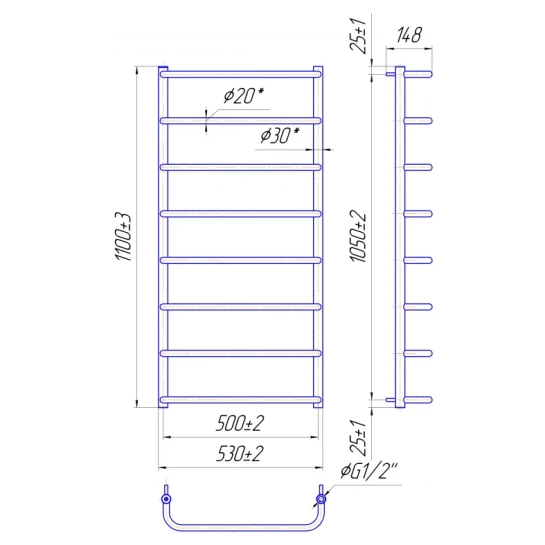 Виробник: Mario Колекція: Стандарт НР 1100х530/500 Артикул: 1.3.0203.01.P Підключення: На гарячу воду Колір: Хром Гарантія: від виробника Висота 1100 мм Ширина 530 мм Глибина 170 мм Міжцентрову відстань 500 мм Кількість ребер: 8 Діаметр підключення: G 1/2 '' Обсяг 2.4 л Вага 5.9 кг Рекомендована потужність ТЕНа (MEG / REG / MOA), W 200 Матеріал: нержавіюча сталь Марка стали: AISI 304 Країна-виробник: Україна Комплект поставки: полотенцесушитель - 1 шт. комплект кріплень - 1 шт. кран Маєвського - 1 шт. заглушка - 1 шт. паспорт - 1 шт. коробка - 1 шт.