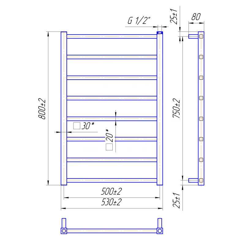 Виробник: Mario Колекція: Токіо 800х530/500 Артикул: 1.2.0600.03.P Підключення: На гарячу воду Колір: Хром Гарантія: від виробника Висота 800 мм Ширина 530 мм Глибина 80 мм Міжцентрову відстань 500 мм Кількість ребер: 8 Діаметр підключення: G 1/2 '' Обсяг 2,6 л Вага 5,5 кг Рекомендована потужність ТЕНа (MEG / REG / MOA), W 200 Матеріал: нержавіюча сталь Марка стали: AISI 304 Країна-виробник: Україна Комплект поставки: полотенцесушитель - 1шт. комплект кріплень - 1шт. кран Маєвського - 1 шт. заглушка - 1шт. паспорт - 1шт. коробка - 1шт.