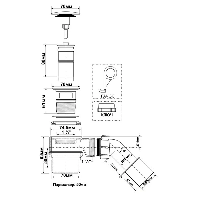 Сифон для ванни з інтегрованим переливом. Зливний корок 70мм виготовлений з латуні, з механізмом "клік-клак"