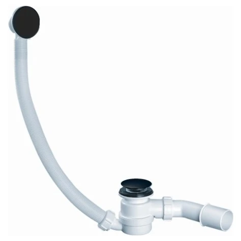 Сифон для ванни/піддону клік-клак 40/50, чорний MCALPINE Характеристики: Очищення: Без аналізу сифона. Кріплення сифону: Шарнір. Пропускна спроможність: 62 л/хв. Висота гідрозатвору: 50 мм. Довжина переливу 330-1000 мм. Гайка: різьблення 1 1/2". Вихідна труба: 40/50 мм. 45 °. Корпус: Поліпропілен. Грати переливу: Нержавіюча сталь. Зливна накладка: Латунь. Висота: 92,5 мм. Макс. товщина зливи ванни: 18 мм. Макс. товщина переливу ванни: 13 мм. Сифон «HC2600CL» призначений для ванної кімнати, а також для високого піддону з переливом. Він має форму пляшки у тій частині, де розміщується гідрозатвор. Такий тип сифону легко очистити, оскільки очищення відбувається зверху. Пляшковий тип набув найбільшого поширення завдяки зручності обслуговування.