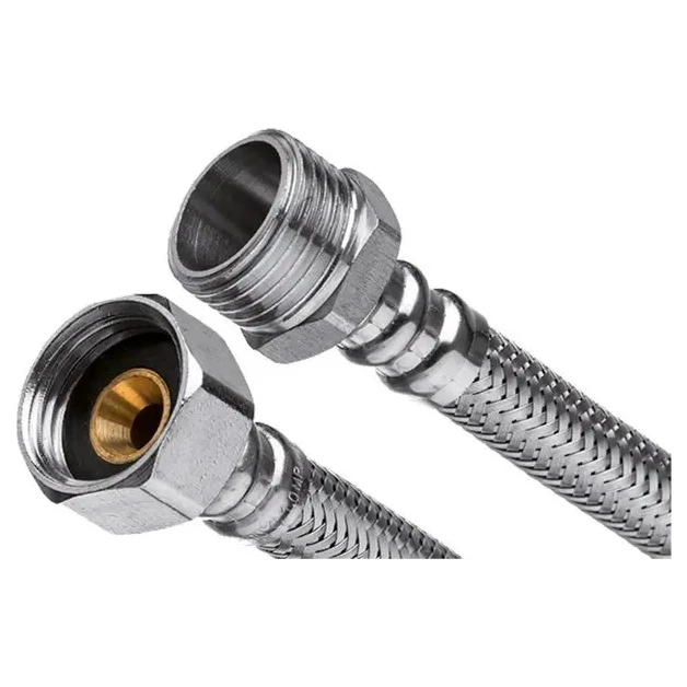 Шланг в стальному оплетенні (1/2н х 1/2в) 50 см. INVENA (WS-06-050) Гнучкі гумові шланги в металевій оплітці з нержавіючої сталі з різьбовими приєднувальними наконечниками – це універсальне з'єднання, що використовується в побутових і промислових системах водопостачання. Гнучка підводка служить для підключення водопровідних приладів (змішувачів, змивних бачків, гидрофорных комплектів та ін) до систем холодного і гарячого водопостачання. Вони незамінні у важкодоступних місцях, де монтаж за допомогою звичайних труб (мідних, сталевих або поліпропіленових) важкий або неможливий. Подібного роду з'єднання гасять виникають в будь-якій системі водопостачання гідравлічні удари, які можуть призвести до її пошкодження. Гнучка підводка зменшує вібрацію і шум, викликані поточної рідиною. Її конструкція характеризується високим межею витривалості при вигині. Крім того, підводка володіє стійкістю до несильним механічних ударів тупим предметом.