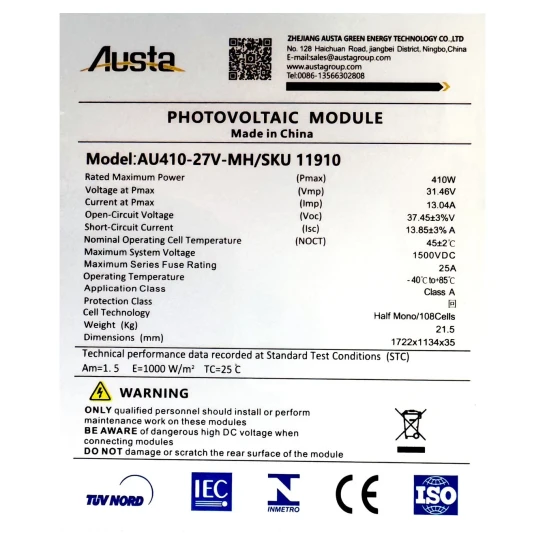 Сонячна панель V-TAC Mono Solar 410 Вт – це потужний і надійний фотомодуль для виробництва електроенергії з сонячного світла. Завдяки високому ККД (22,3%) і передовим технологіям, панель забезпечує максимальну віддачу енергії протягом всього терміну служби. Ідеальне рішення для облаштування автономних систем електропостачання для дому, дачі або невеликого бізнесу. Ключові характеристики: Потужність: 410 Вт Напруга: 31.46 В Струм: 13.04 А ККД: 22,3% Довговічність: 25 років гарантії на лінійну потужність Переваги: Висока ефективність Стійкість до зовнішніх впливів Довгий термін служби Проста установка