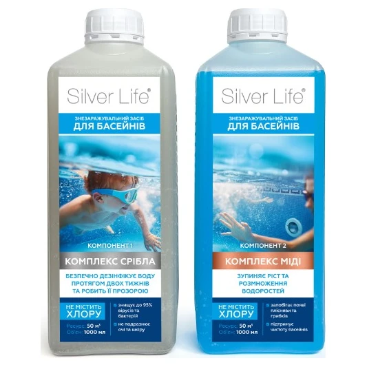 SVOD Silver Life — це інноваційний безхлорний набір для комплексного знезараження та очищення води в басейнах і фонтанах. Цей гіпоалергенний продукт складається з двох окремих пляшок з активними компонентами, які використовуються разом, щоб забезпечити високу якість води, знищити шкідливі мікроорганізми та запобігти утворенню водоростей, роблячи воду прозорою та приємною для купання.