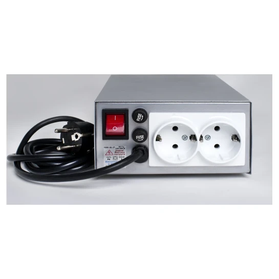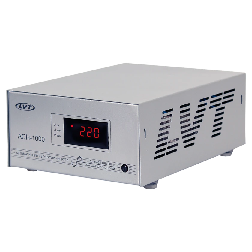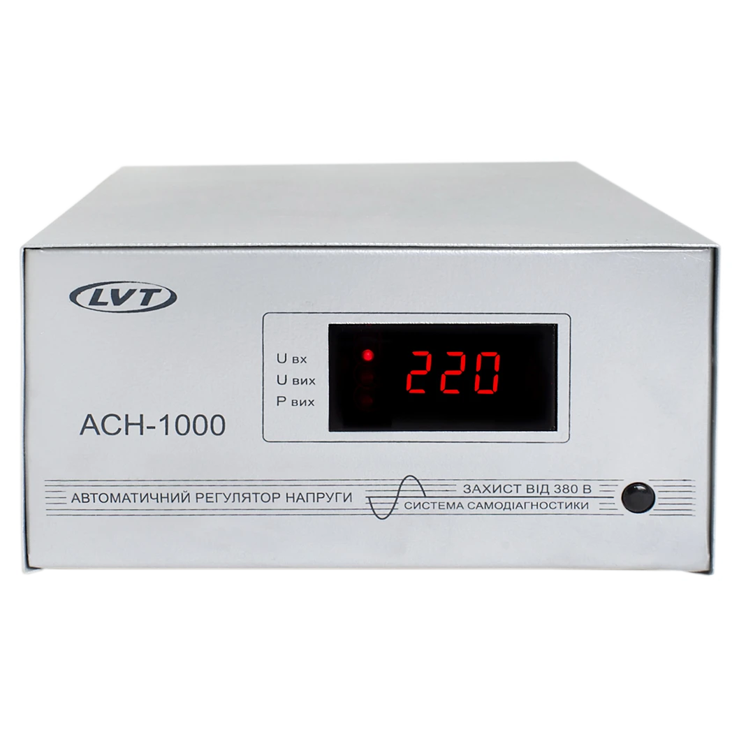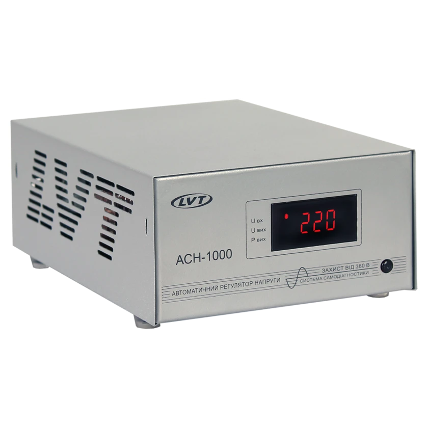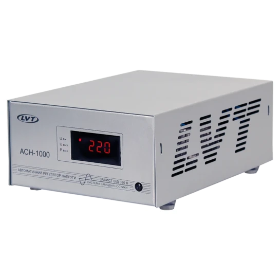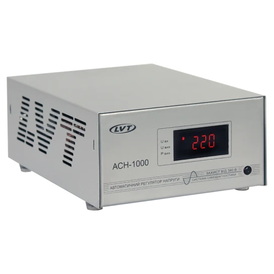 Автоматичний регулятор напруги АСН-1000 призначений для роботи з побутовими електроприладами з потужністю споживання до 1000 Вт від мережі 220 В, 50 Гц забезпечує автоматичний контроль і регулювання напруги мережі, а також захист від зниженої і підвищеної напруги та високовольтних імпульсів. АСН-1000 призначений у першу чергу для захисту побутових холодильників, морозильних камер, систем керування автономного опалення та іншої електроапаратури з асинхронними електродвигунами загальною потужністю споживання до 1000 Вт (пусковою до 5000 Вт). АСН-1000 має цифровий вимірювач та індикатор напруги мережі живлення, вихідної напруги і потужності споживання під’єднаного приладу. Пристрій обладнаний тепловим захистом і захистом від перевантаження.