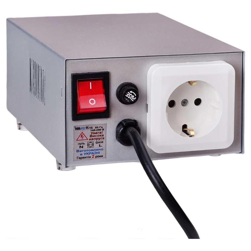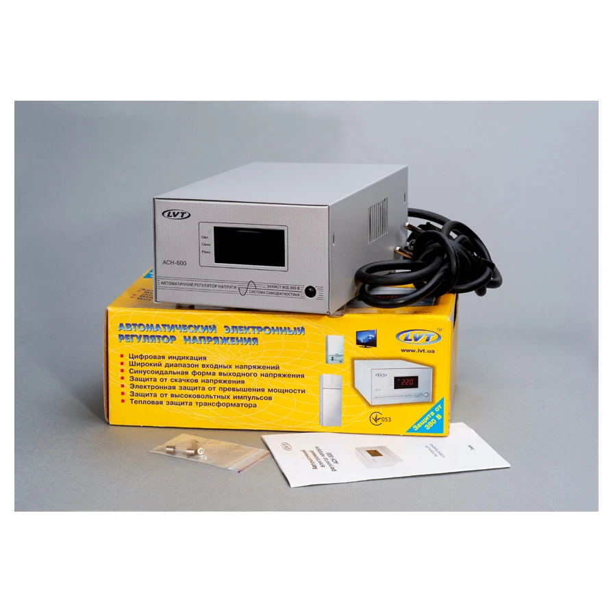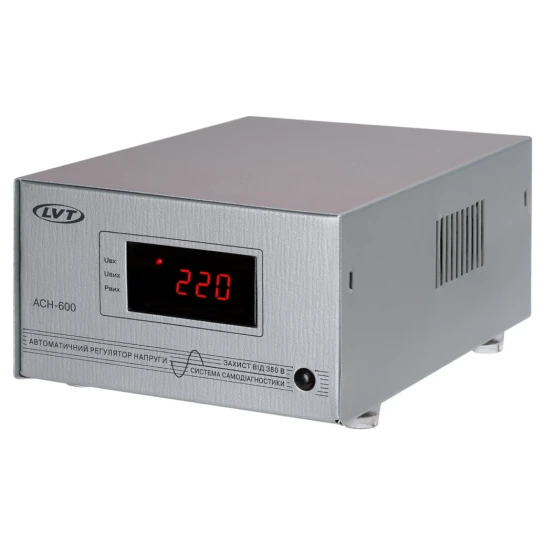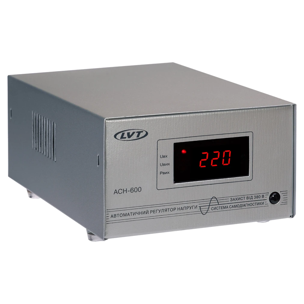 Автоматичний регулятор напруги АСН-600 призначений для роботи з побутовими електроприладами з потужністю споживання до 600 Вт від мережі 220 В, 50 Гц забезпечує автоматичний контроль і регулювання напруги мережі, а також захист від зниженої і підвищеної напруги та високовольтних імпульсів. АСН-600 призначений у першу чергу для захисту побутових холодильників, морозильних камер, систем керування автономного опалення та іншої електроапаратури з асинхронними електродвигунами загальною потужністю споживання до 600 Вт (пусковою до 4000 Вт). АСН-600 має цифровий вимірювач та індикатор напруги мережі живлення, вихідної напруги і потужності споживання під’єднаного приладу. Пристрій обладнаний тепловим захистом і захистом від перевантаження.