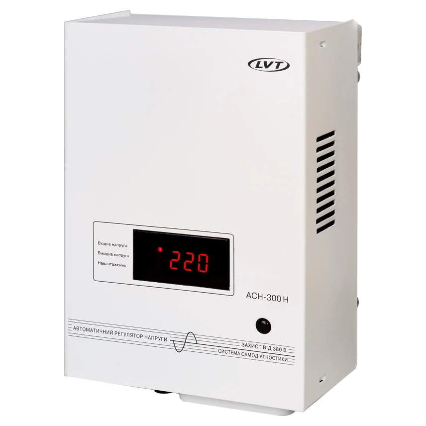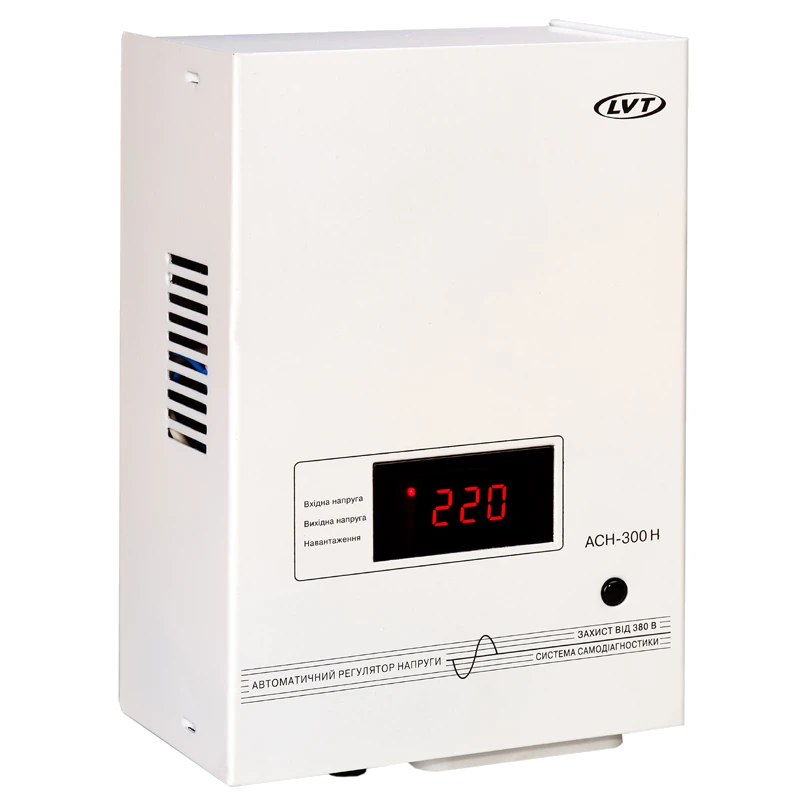 Автоматичний регулятор напруги АСН-300 Н призначений для роботи з побутовими електроприладами з потужністю споживання до 300 Вт від мережі 220 В, 50 Гц забезпечує автоматичний контроль і регулювання напруги мережі, а також захист від зниженої і підвищеної напруги та високовольтних імпульсів. АСН-300 Н призначений у першу чергу для покращення захисту систем керування автономного опалення, та для стабілізації живлення телевізорів, аудіо та відео техніки, комп’ютерів та іншої електронної апаратури з потужністю споживання до 300 Вт. АСН-300 Н має цифровий вимірювач та індикатор напруги мережі живлення, вихідної напруги і потужності споживання під’єднаного приладу. Пристрій обладнаний тепловим захистом і захистом від перевантаження. АСН-300 H може експлуатуватись як у горизонтальному так і у вертикальному положенні. Для монтування на вертикальній поверхні комплектується дюбелями.