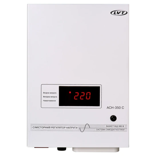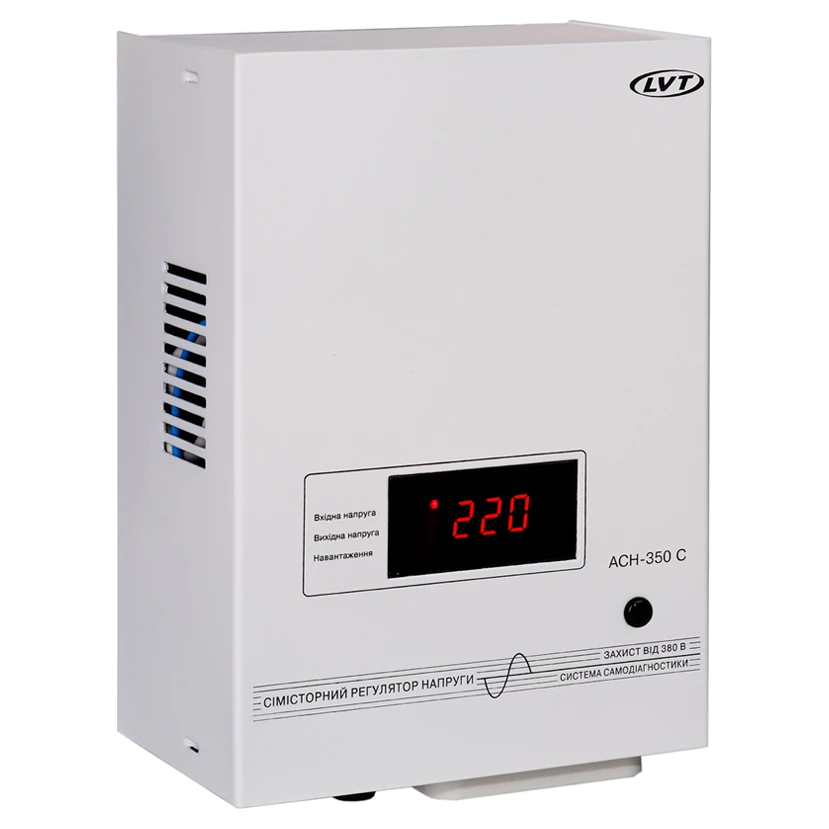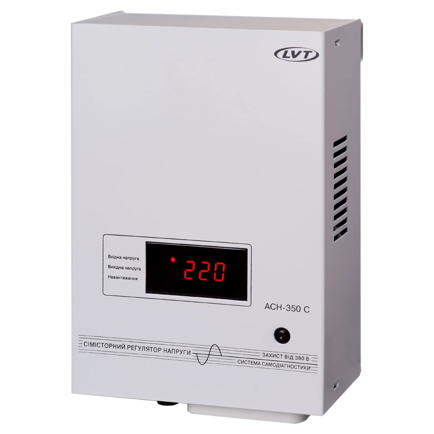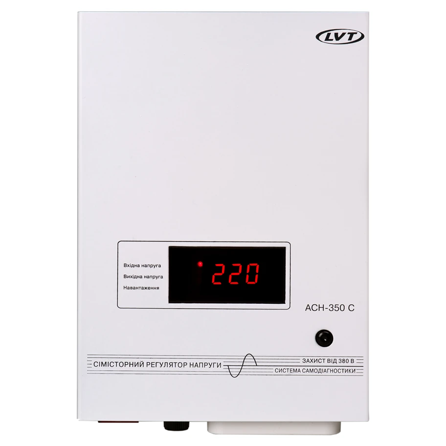 Автоматичний сімісторний регулятор напруги АСН-350 C призначений для роботи з побутовими електроприладами з потужністю споживання до 350 Вт від мережі 220 В, 50 Гц забезпечує автоматичний контроль і регулювання напруги мережі, а також захист від зниженої і підвищеної напруги та високовольтних імпульсів. АСН-350 C призначений у першу чергу для покращеного захисту систем керування автономного опалення та іншої електроапаратури з асинхронними електродвигунами загальною потужністю споживання до 350 Вт (пусковою до 2500 Вт). АСН-350 С має цифровий вимірювач та індикатор напруги мережі живлення, вихідної напруги і потужності споживання під’єднаного приладу. Пристрій обладнаний тепловим захистом, захистовм від 380 В і захистом від перевантаження. АСН-350 С може експлуатуватись як у горизонтальному так і у вертикальному положенні. Для монтування на вертикальній поверхні комплектується дюбелями.