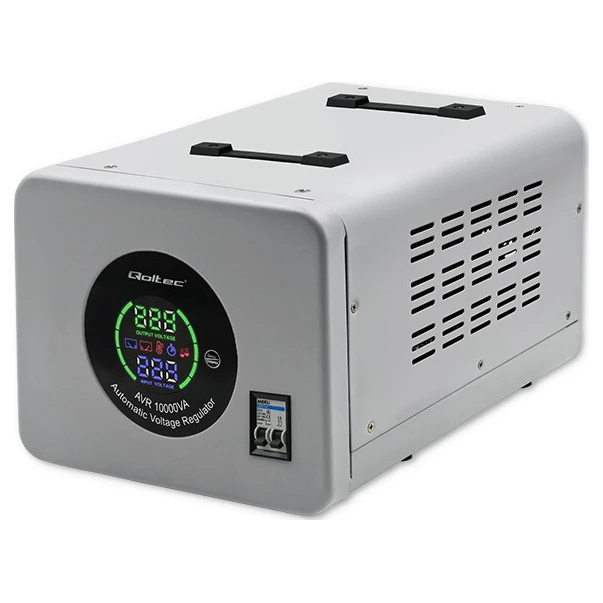 Автоматичний стабілізатор напруги Qoltec AVR-10000VA обладнаний дисплеєм, який надає можливість спостерігати за параметрами роботи пристрою. Такий виріб стане у пригоді там, де треба забезпечити якісні характеристики електричного струму: для живлення приладів у системах з котлами опалення, для побутової техніки, серверних і домашніх комп'ютерів тощо. Стабілізатор напруги Qoltec AVR-10000VA забраний у металевому корпусі сірого кольору, обладнаний ручками для зручності перенесення на інше місце встановлення. Має функцію затримки між вимкненням і увімкненням, захист від перегрівання, підвищеної та зниженої напруги, короткого замикання у мережі. Час затримки вихідної напруги: 6 сек/180 сек.