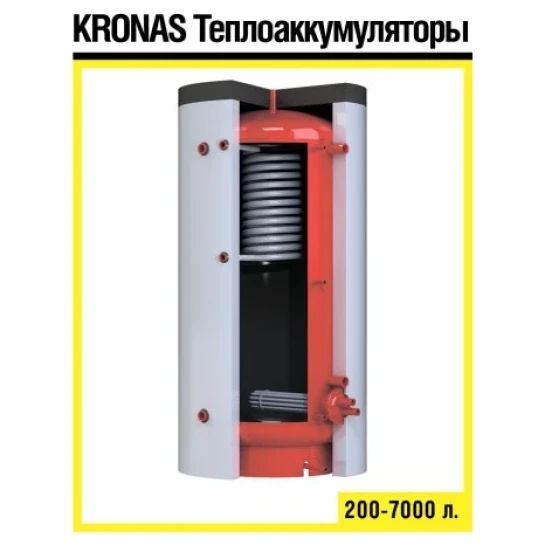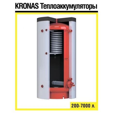 Теплоакумулятор KRONAS - Акумулююча (Буферна) ємність. Артикул: ТА0.2000.180 Обсяг ємності: 2000 л Виробник: Kronas Вага: 288 кг Теплоакумулятор KRONAS для твердопаливного котла це універсальний пристрій, який значно підвищує ефективність роботи системи опалення. Буферна ємність системи опалення одночасно вирішує кілька завдань: - приймає надлишок теплової енергії виробленої котлом й таким чином, котел не входить в режим малої потужності або тління (при якому відбувається значне зниження ККД за рахунок збільшення частки СО) - подовжує період між завантаженнями палива - подовжує період між обслуговуванням котла. При відсутності режиму тління, теплообмінник котла значно менше піддається засміченню, зберігаючи високий ККД виключає ймовірність закипання котла. При правильній обв'язці, теплоаккумулятор прийме на себе надлишок тепла, вироблений котлом, наприклад, при відключенні електроенергії. Використовуючи додаткові патрубки, теплоаккумулятор можна підключити до декількох котлів одночасно).
