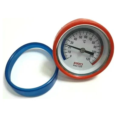 Термометр PROFACTOR біметалевий діаметром 43 мм аксіальний призначений для вимірювання температури рідких та газоподібних середовищ, не агресивних по відношенню до матеріалів виробу в системах водопостачання, опалення та охолодження. Термометр вимірює температуру у діапазоні 0–120°С, не підлягає обов'язковій сертифікації.