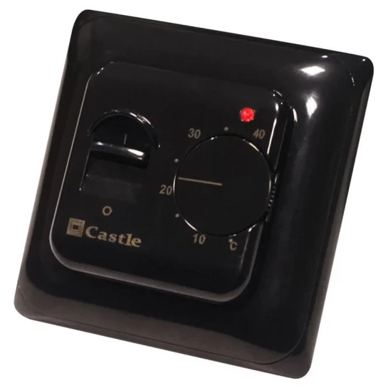 Простий та надійний механічний терморегулятор для управління кабельними та плівковими електричними теплими підлогами. Країна виробництва – Китай. Управління проводиться лише двома елементами: тумблер включити/вимкнути та регулювальне коліщатко зміни температури від +5 до +40 °С. Пристрій оснащений лише датчиком температури підлоги. Датчик на дроті має довжину 3 метри та встановлюється в гофротрубку (входить до комплекту теплої підлоги). Монтується терморегулятор в підрозетник стандартного діаметра (60 мм), але рекомендуємо вибирати настановні коробки - поглиблені (глибші ніж зазвичай). Це спростить процес встановлення пристрою.