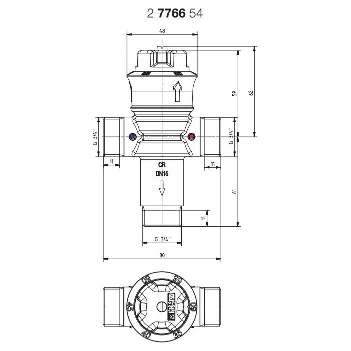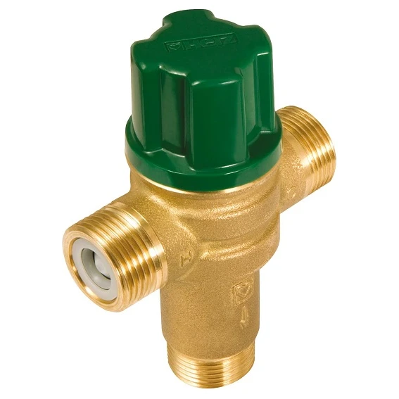 Термозмішувальний клапан HERZ TMW 2 із зміною напрямку потоку холодної та гарячої води до систем п/в це унікальний виріб який застосовується для систем постачання питної води. Клапан є регулювальним елементом системи водопостачання. Дозволяє автоматично підтримувати постійну задану температуру на виході змішаної води. Усередині змішувального клапана встановлено термостатичний елемент, який створює коректне змішування гарячої та холодної води. Пристрій забезпечує автоматичну підтримку встановленого температурного режиму, навіть у разі, коли виникають перепади тиску при водорозборі гарячої чи холодної води іншими споживачами. Корпус виготовлено з якісної латуні, що надійно захищає від корозії. Максимальний тиск 10 бар. Мінімальна витрата води 4 л/хв. Заводське налаштування: 45 °C.
