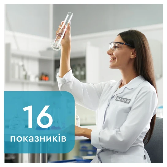 Лабораторний стандартний тест на 16 показників: рН, каламутність, твердість, загальна лужність, загальне залізо, марганець, нітрати, окиснюваність, сухий залишок, запах, кальцій, магній, гідрокарбонати, сульфати, хлориди.