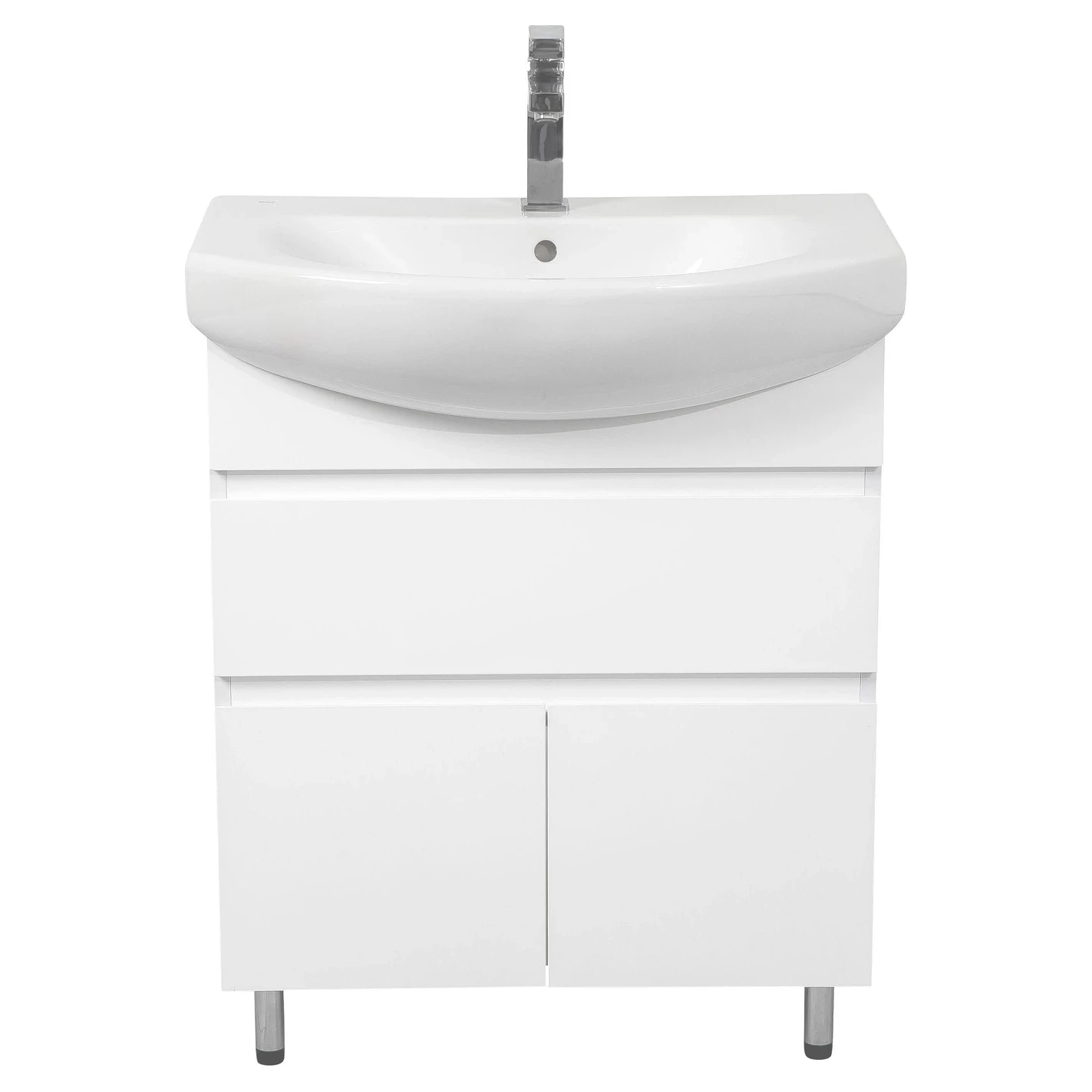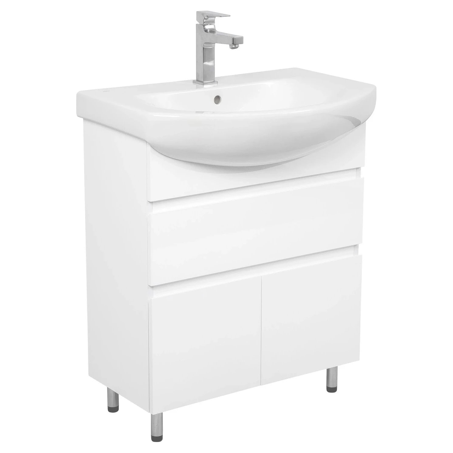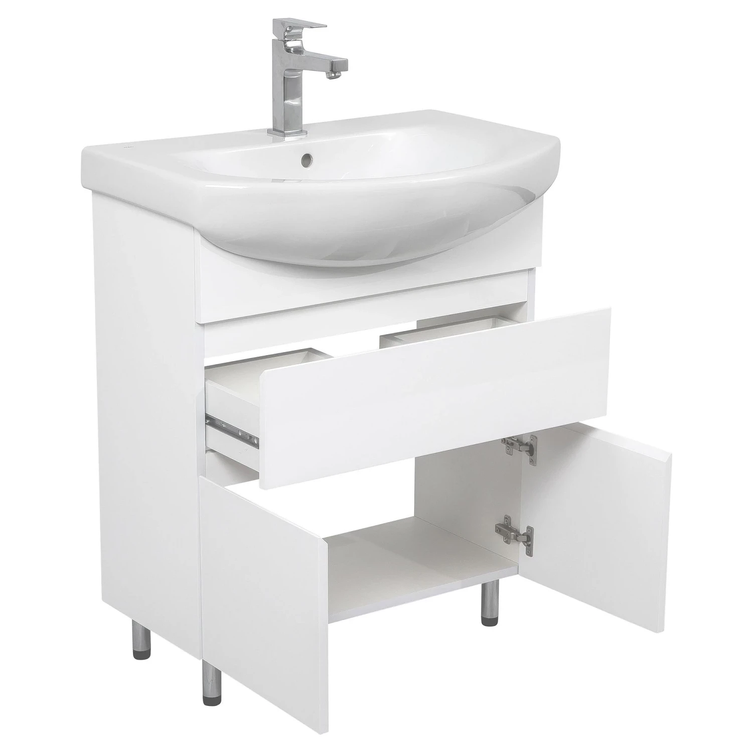 Колекція Уно від Aqua Rodos - це красиві меблі для ванної кімнати, що потішать поціновувачів мінімалізму в оформленні інтер'єру. Тумба Уно виконана в популярному мінімалістичному стилі. Корпус тумби виконаний ДСП у білому глянсовому фарбуванні, а фасади з МДФ пофарбовані білою глянсовою фарбою. Конструктивно тумба складається з 2 містких відділень, з 2 орними дверцятами та висувної шухляди, що дає змогу максимально ефективно використовувати простір усередині тумби. На тумбі немає виступаючих деталей і фурнітури, ручки фрезеровані під кутом 45%. До тумби відмінно підходить зручна сучасна керамічна раковина Руна 70 см від виробника Kolo. Тумба виготовленні в підлоговому виконанні, в комплекті йдуть ніжки, які покупець прикручує самостійно.