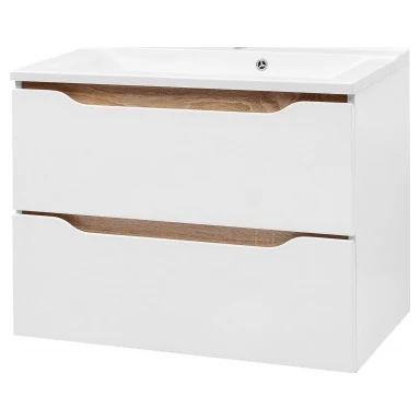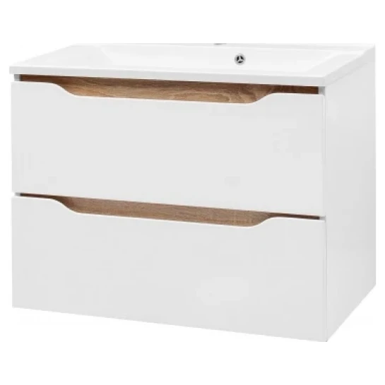Тумба Амелія навісна з умивальником Глорія 80 біла V.M. Комплект: тумба з двома ящиками та раковина Gloria 80 Van Mebles Амелія колір білий, вставки дуб сонома Корпус - ламіноване ДСП 16 мм. Фасад – МДФ із двостороннім ламінуванням 16 мм Меблі фарбовані глянсовою емаллю Гарантія 2 роки Раковина купується окремо