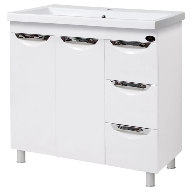 Тумба Лора з умивальником Глорія 90 з 3-ма шухлядами, 2-ма дверцями, врізні ручки V.M. Лора – серія, що поєднує комфорт і класичний дизайн. Тумба у своїй конструкції має три ящики оснащені якісним механізмом плавного закривання. У лівій частині розташовані дверцята із системою soft-close. Внутрішній простір розділений полицею, що дозволяє зберігати додаткові речі у ванній кімнаті. Корпус тумби виготовлений із ламінованого ДСП 16 мм. Фасад – МДФ двостороннього ламінування 16 мм. Комплектується модель ніжками із алюмінію. Тумба поставляється у зібраному вигляді. Характеристики: Колір фасаду: Білий Ширина тумби: 80 см Ширина модуля: ЛДСП/МДФ Умивальник: Кераміка Відкриття дверей: Зліва, зправа Тип монтажу: Підлоговий