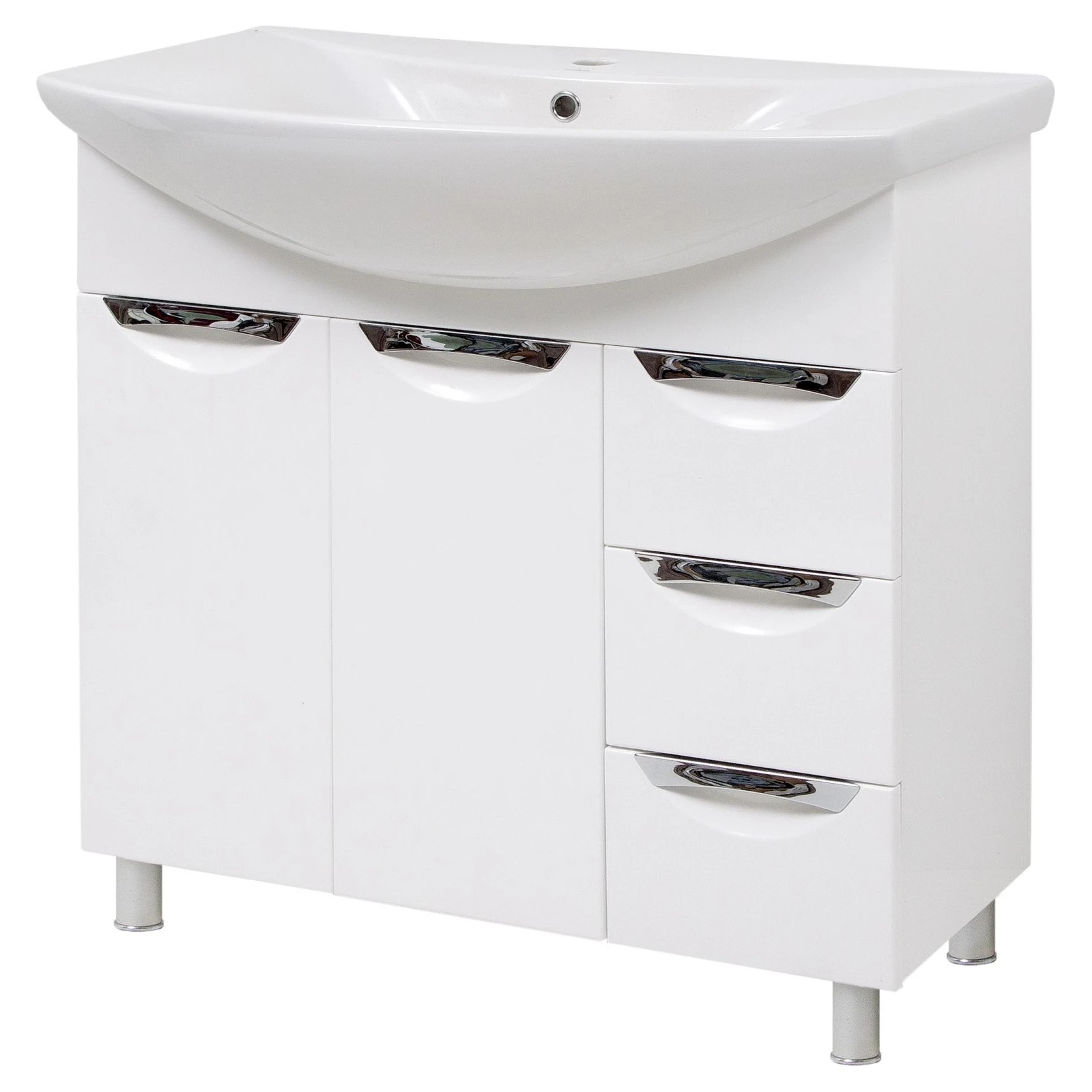 Тумба Лора з умивальником Комо 80 з 3-ма шухлядами, 2-ма дверцями, врізні ручки V.M. (000001307) Лора – серія, що поєднує комфорт і класичний дизайн. Тумба у своїй конструкції має три ящики оснащені якісним механізмом плавного закривання. У лівій частині розташовані дверцята із системою soft-close. Внутрішній простір розділений полицею, що дозволяє зберігати додаткові речі у ванній кімнаті. Корпус тумби виготовлений із ламінованого ДСП 16 мм. Фасад – МДФ двостороннього ламінування 16 мм. Комплектується модель ніжками із алюмінію. Тумба поставляється у зібраному вигляді. Характеристики: Колір фасаду: Білий Ширина тумби: 80 см Ширина модуля: ЛДСП/МДФ Умивальник: Кераміка Відкриття дверей: Зліва, зправа Тип монтажу: Підлоговий