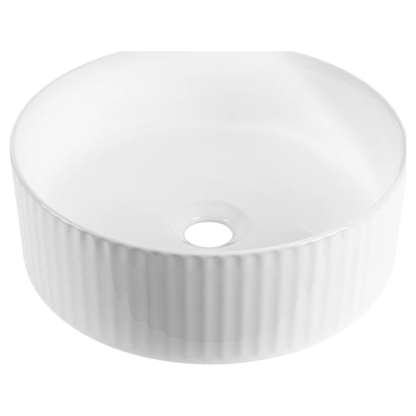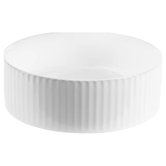 Перетворіть свою ванну кімнату на оазис стилю та елегантності з надзвичайно модною накладною раковиною Glamour CE-63-001. Ця кругла раковина діаметром 36 см, виконана в позачасовому білому кольорі з глянцевим покриттям, є ідеальним рішенням для сучасних інтер'єрів. Її унікальний дизайн поєднує в собі простоту форми та виразні ребристі елементи, які надають їй динамічного та привабливого вигляду. Раковина Glamour ребриста вражає своїми високими краями та плоским дном, створюючи вигляд геометричної фігури, що відповідає останнім тенденціям у дизайні інтер'єрів. Її універсальний розмір дозволяє використовувати її як у невеликих ванних кімнатах, так і у просторих салонах краси. Особливу увагу привертають вертикальні ребра (жолоблення) по зовнішній стороні раковини, які не тільки додають їй унікальності, але й ефектно відбивають світло, посилюючи блискучий ефект глянцевого покриття. Завдяки своїй відносно великій глибині внутрішньої чаші (10 см), накладна раковина Glamour забезпечує легкість у підтримці чистоти