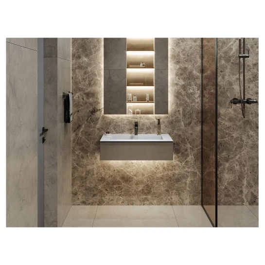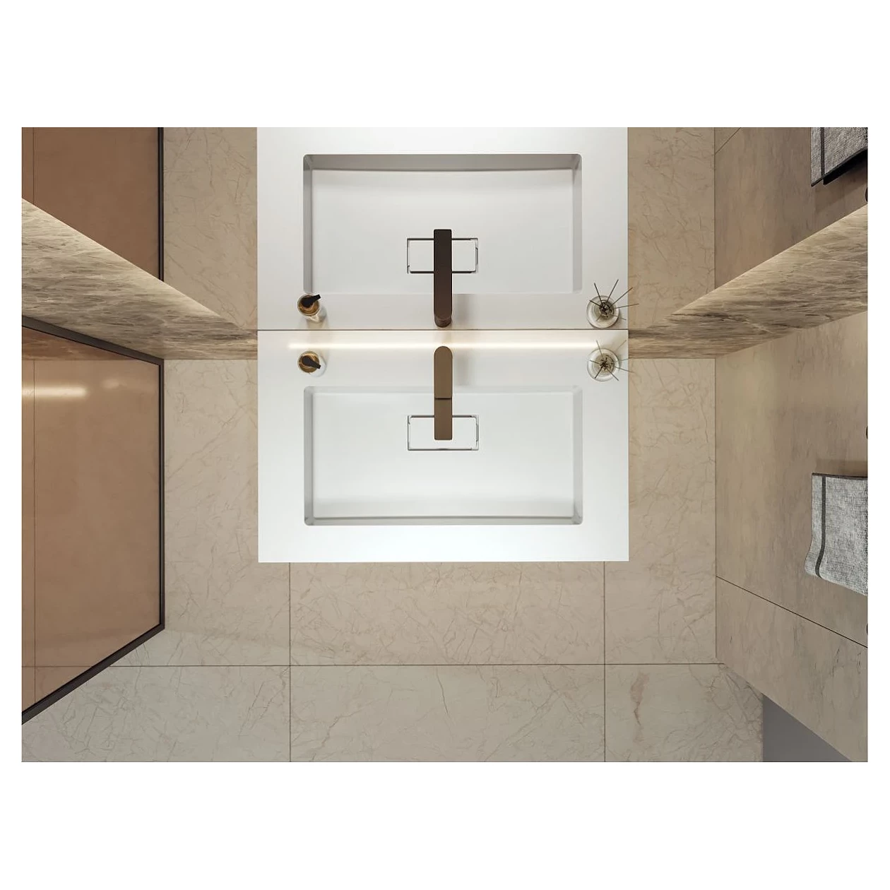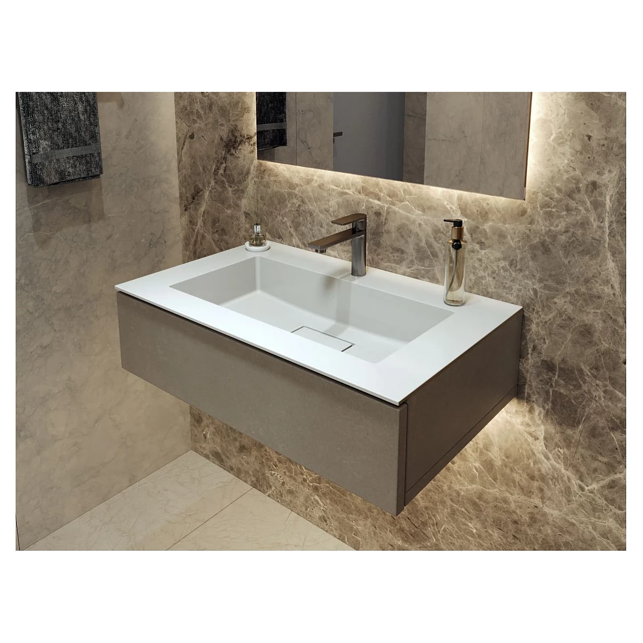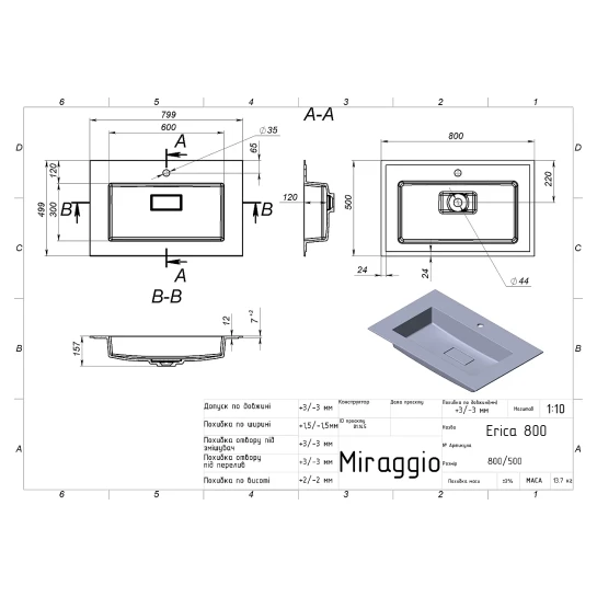 Прямокутний плаский умивальник з литого мармуру ERICA 800 - ідеальний вибір для ванної кімнати. Прямі лінії чаші, чіткі обриси форми раковини привертають увагу гостей та забезпечують щоденний комфорт власнику ванної кімнати. Умивальник ідеально пасуватиме дизайну в стилі модерн та хайтек.Раковина має накладний та врізний спосіб монтажу. Крила умивальника зручні для розміщення косметичних засобів. Отвір під злив прихований декоративною накладкою. Сантехніка MIRAGGIO виробляється за авторською технологією змішування мармуровою крихти та поліефірної смоли в вакуумі. Матеріал умивальника - MIRAMARBLE. В його структурі відсутні мікропори, що виключає розвиток бактерій в товщі стінок. Додатково виріб покритий антибактеріальним гелем. Поверхня умивальника глянцева. Литий мармур відрізняється здатністю поглинати звуки води та приймати температуру довкілля. Завдяки цьому умивальник з литого мармуру безшумний, зручний та надійний. Він стійкий до температурних перепадів, забруднень та подряпин.