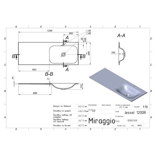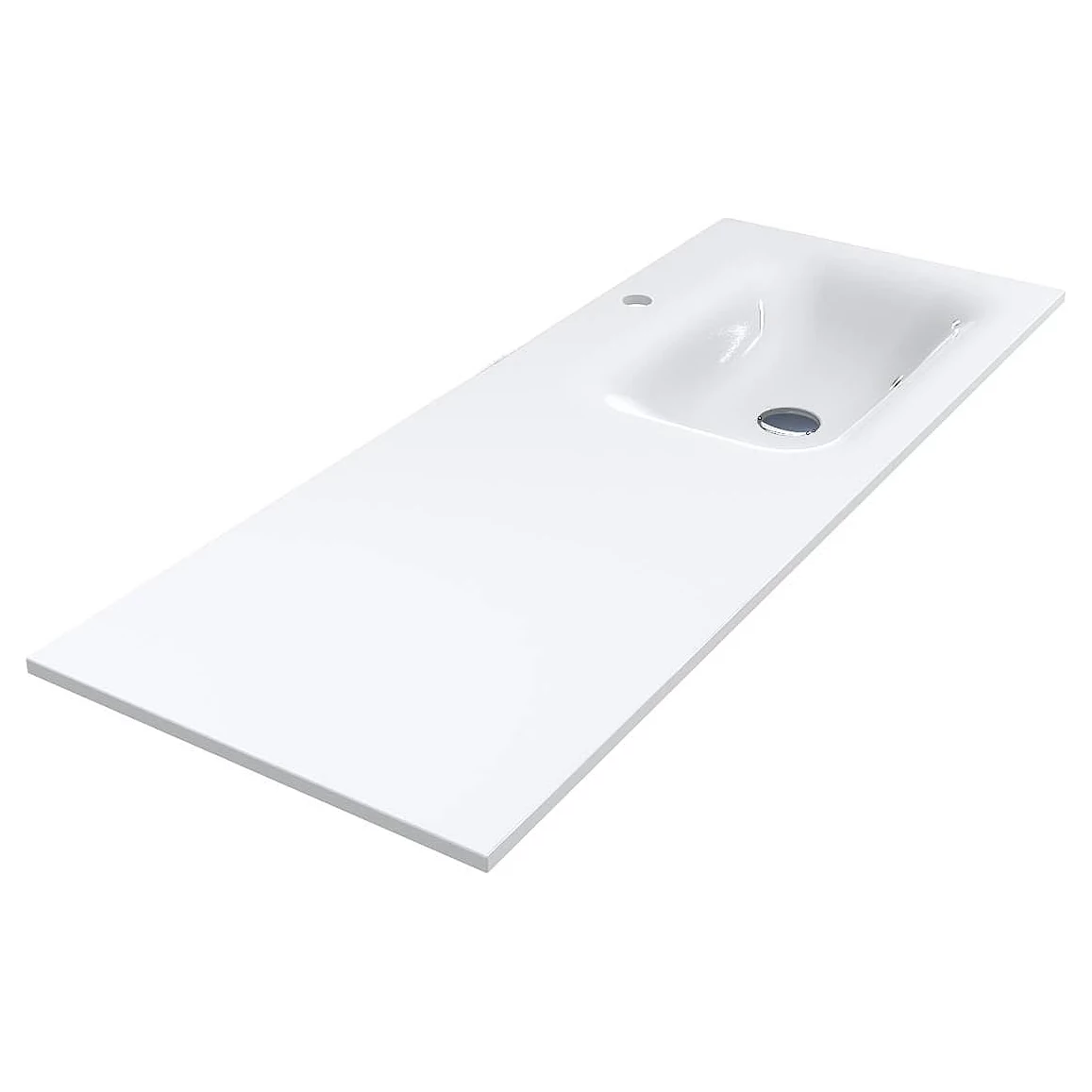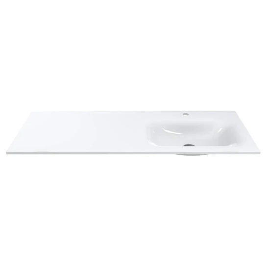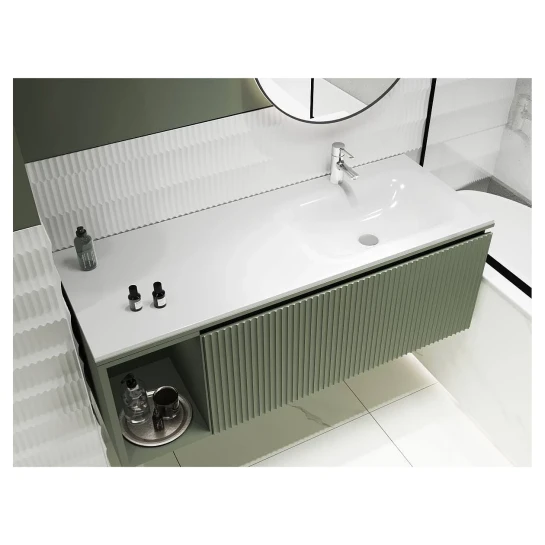 Меблевий умивальник з литого мармуру JESSEL 1200 R з крилом зліва від чаші – оптимальне рішення, якщо локація ванної кімнати вимагає змістити раковину у певний бік. Плавні лінії чаші перешкоджають розбризкуванню води, широке крило дозволяє зручно розмістити гігієнічні засоби. Умивальник має кілька типів монтажу - накладний та врізний. Сантехніка MIRAGGIO виробляється за авторською технологією змішування мармуровою крихти та поліефірної смоли в вакуумі. Матеріал умивальника - MIRAMARBLE. В його структурі відсутні мікропори, що виключає розвиток бактерій в товщі стінок. Додатково виріб покритий антибактеріальним гелем. Поверхня умивальника глянцева. Литий мармур відрізняється здатністю поглинати звуки води та приймати температуру довкілля. Завдяки цьому умивальник з литого мармуру безшумний, зручний та надійний. Він стійкий до температурних перепадів, забруднень та подряпин. Оптимальний температурний діапазон експлуатації виробу від -65 до +65 °C.