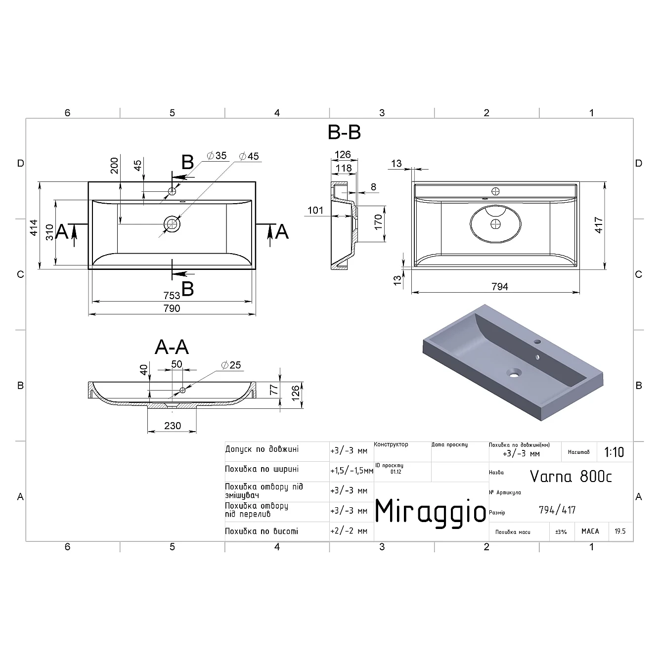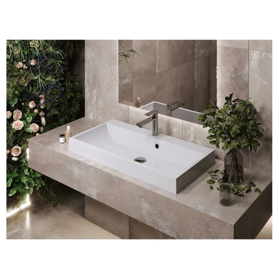 Умивальник VARNA 800 від Miraggio має прямокутну форму з чіткими бічними контурами. Внутрішня раковина вирізняється плавними вигинами, які забезпечують зручність під час використання та догляду. Глибока конструкція раковини допомагає запобігти розбризкуванню води, що додає комфорту при експлуатації. Класичний дизайн умивальника зробить його стильним акцентом у вашій ванній кімнаті в будь-якому інтер’єрі, а наявність розмірної сітки дозволить вписати його як в маленький простір, так і просторий. У заводському варіанті присутні отвори для змішувача та переливу, ви можете замовити умивальник без жодного отвору або з одним на вибір за бажанням. Додатково доступне покриття зовнішньої стінки умивальника згідно палітри RAL. Раковина має накладний тип монтажу, тобто на тумбу, проте можна встановити на стільницю або додатково зробити отвори й підвісити умивальник на стіну.