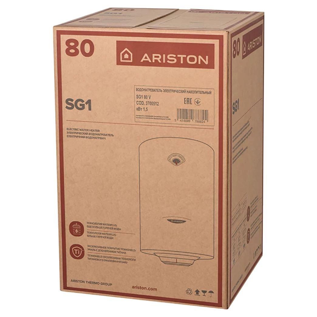 Накопичувальний електричний водонагрівач ARISTON SG1 80 V на 80 літрів від італійського бренду призначений для задоволення побутових потреб у гарячій воді. Запатентована інноваційна технологія WaterPlus утримує холодну воду, що надходить, на дні бака. Таким чином виключене змішування холодної і вже нагрітої\ води. Це дає змогу отримати на 16% більше гарячої води для насолоди справді гарячим душем у будь-який час. Внутрішня поверхня баку вкрита титановою емаллю, що робить водонагрівач ще більш стійким і надійним.
