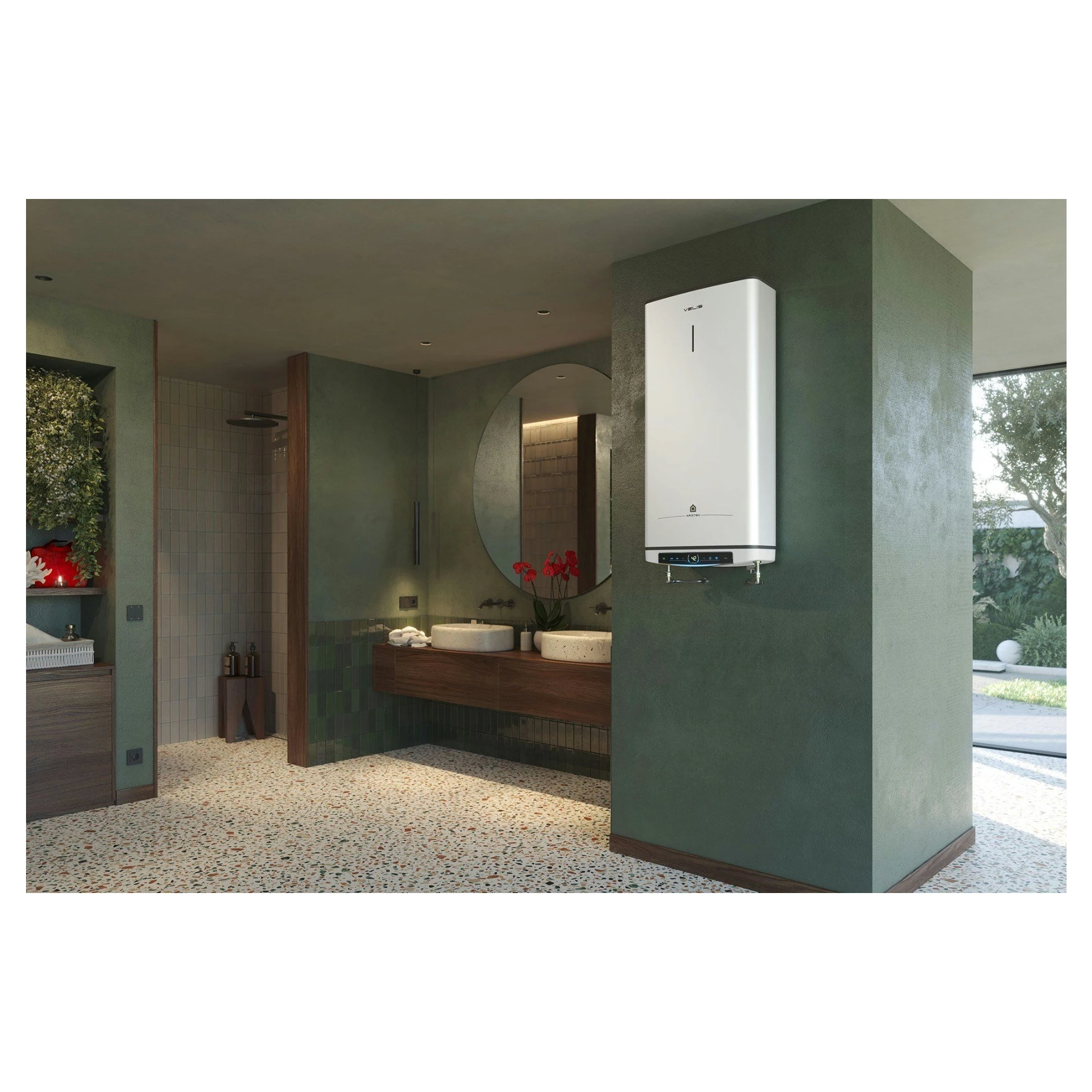Надтонкий електричний водонагрівач, простий і гнучкий в установці. Відрізняється високою якістю, неперевершеною зручністю експлуатації та преміальним дизайном. Складається з подвійного титанового та магнієвого анода для полстійного захисту 2 резервуарів. Його висококласний сенсорний екран забезпечує оптимальний комфорт користувача та інтеграцію в будь-який інтерєр. Також має вбудований WI-FI та сухий тен.