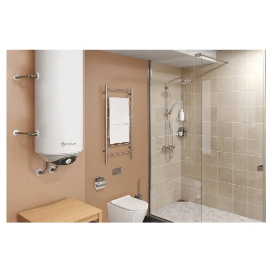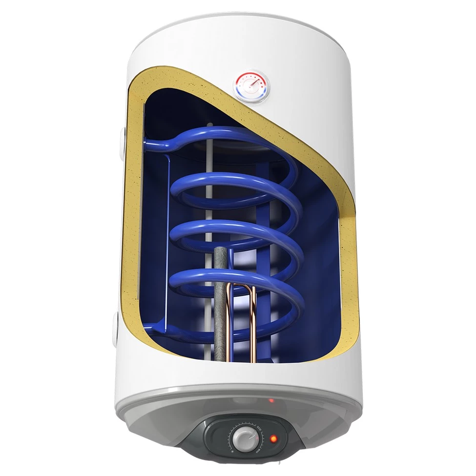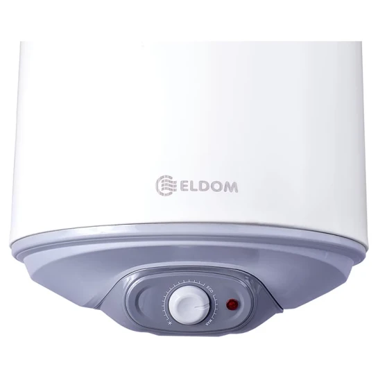 Водонагрівач комбiнований ELDOM THERMO 80 L (S) правий (арт. WV08046TRG) належить до економічної серії водонагрівачів. В його будові є теплообмінник, який може бути підключений до додаткових джерел енергії, таких як сонячний колектор, газовий та твердопаливний котел. Площа змієвіка становить 0,24 м.кв. Електричний мокрий ТЕН має потужність 2 кВт. Терморегулятор зовнішній. Бойлер такого об’єму може забезпечити комфортне користування гарячою водою у побутові для 2–3 осіб.