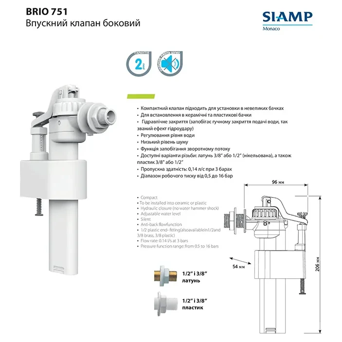 Впускний клапан Siamp Brio 751-1/2P — це високоякісний клапан для зливного бачка унітаза, призначений для швидкого та ефективного наповнення водою. Він виготовлений з міцного пластику, що забезпечує довговічність та надійність у використанні.
