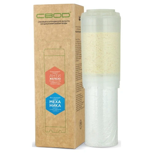 Призначений для видалення заліза із водопровідної води. В результаті застосування картриджа знижується вміст дво- та тривалентного заліза до нормативних показань (0,2-0,3 мг/л), видаляється марганець у воді, запобігає утворенню іржавих потік на сантехніці, забирається металевий запах і смак з води. При установці в систему очищення питної води рекомендовано розміщувати після фільтру механічного очищення. Підходить для всіх стандартних колб 10”.