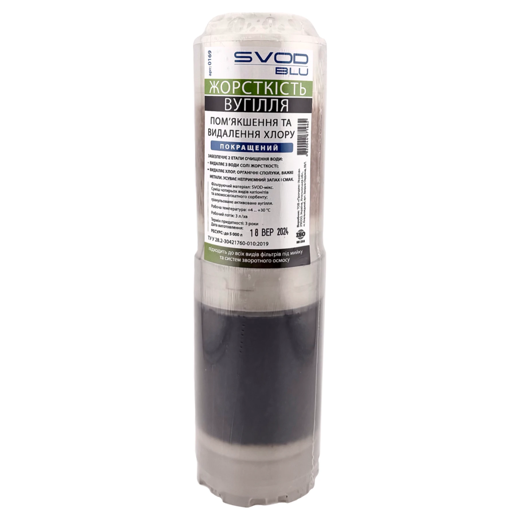 Пом'якшує питну воду, знижує вміст хлору та органічних речовин. Покращує колір, запах та смак води. ПОКРАЩЕНИЙ за рахунок SVOD-mix - суміш чотирьох видів катіонітних смол і алюмосилікатного сорбенту, а також суміші вугілля. Підходить до всіх видів фільтрів під мийку та систем зворотного осмосу.